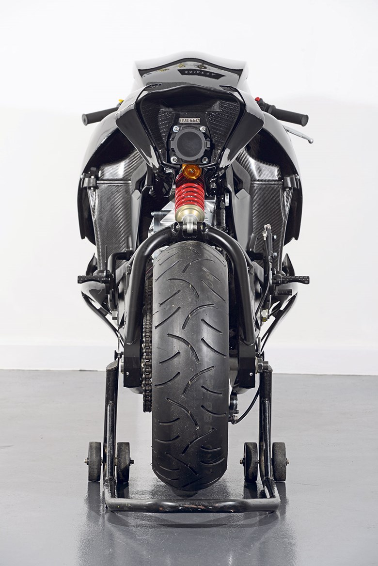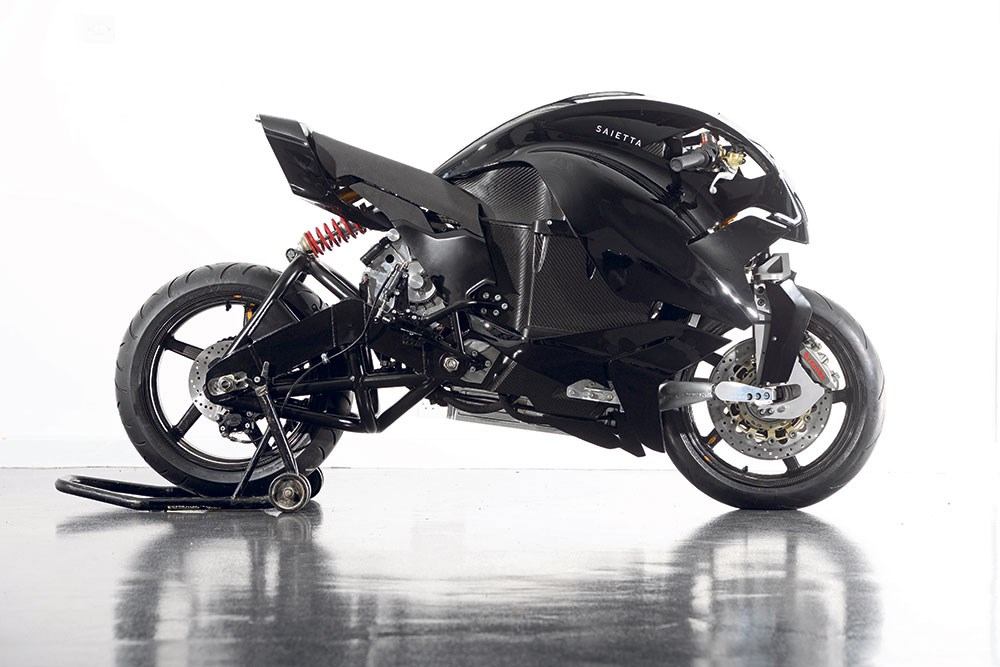 The Saietta Group headquartered in the UK hasn’t just invested in the most advanced electric motor design, they devoted the same attention to the chassis, suspension and aerodynamics. A few high points shared with us from Motorcycle News blew my mind that were on a motorcycle. The first was that the Saietta has an advanced monocoque battery casing made of carbon fiber, a double-wishbone front suspension and that it doesn’t carry a gearbox or clutch.