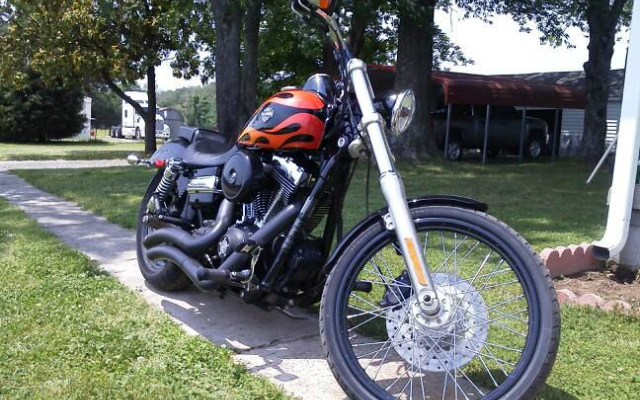 HDForums member Dustin, who is also known by his username moto465, has recently taken on his first build, and it’s definitely coming along well! The ride is a 2010 Harley-Davidson Wide Glide that is currently black with flames on the tank. Of course, it’s looks aren’t the only appealing thing about this bike! So far, Dustin has added eighteen inch apes, a twenty-three inch SMT Simply Sinister front wheel, four inch stretched bags, and more!
