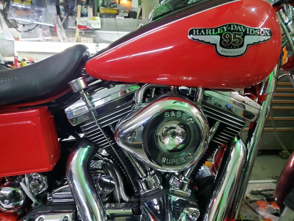 The bike was reassembled with about as much chrome as you can fit on a Dyna. The seller advises that some of the polished stainless steel parts were custom made just for this bike.