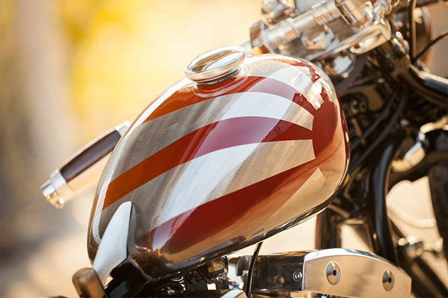 Metal work is no less impressive; the tank was narrowed and tunneled. The paint process follows Carl’s very deliberate steps. “The rising sun was masked up then sand blasted. A few coats of candy red fading to orange then a clear coat. This exposes the grinding disk finish on the metal.” Completing the metal work is a custom fabricated exhaust in mild steel with exposed welds.