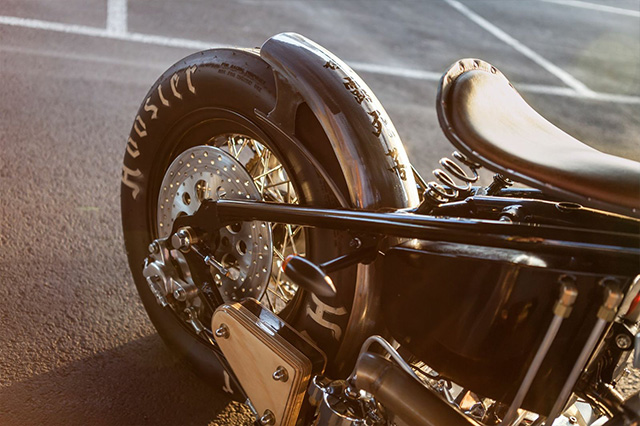 The bike features piano pedal footrests, hand turned wooden hand grips and matching wooden box that houses the relays. Wood on a motorcycle is a huge risk, often looking out of place or stuck on randomly, but Carl’s pulls off the look and the wood parts fit the style perfectly. inverted levers with a Kawasaki master cylinder control the leading brake.