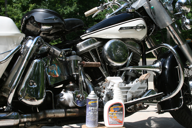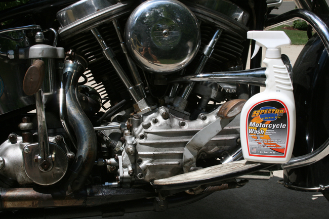 For those of you who ride vintage iron, you understand just how filthy these motorcycles can get after a few hundred miles of riding. Besides being subject to the usual amount of bugs and road grime, old motorcycles also produce a good bit of grease and grime on their own. I’m not saying that my ’64 Duo-Glide leaks a lot of oil, but the engine does “sweat” a little when out on the highway. Plus there is the chain oiler which is constantly spraying a fine mist of oil onto the rear chain. Not being one to spend all my time washing and polishing, I’m always on the look out for products that will easily clean my motorcycle and get me back on the road as quick as possible. With that goal in mind, I decided to try two products from Spectro Performance Oils.
