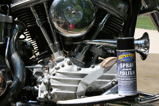 Spectro makes a wide range of performance lubricants and since I trust them to keep my engine and transmission running smoothly, I thought I would see how their products handle the outside of the my motorcycle. I started out with their Premium Motorcycle Wash, which you simple spray on and rinse off. After the first application, my Panhead was dramatically cleaner and I hadn’t even touched it. There were still some spots that needed attention, so as per the instructions, I sprayed the bike down again and lightly scrubbed the trouble areas with a wet rag. Check out the results on my right saddlebag pictured below. You can see that just spraying on the product and rinsing it off got rid of the majority of the grease and grime.