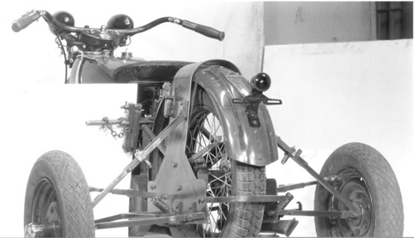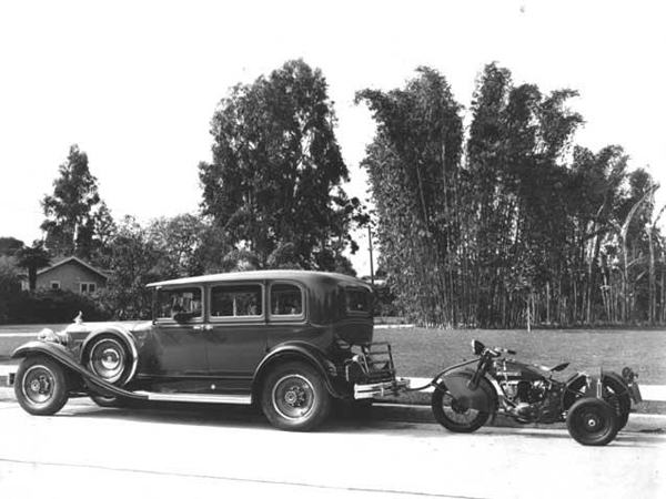 In the 1920’s, most service stations delivered automobiles back to their customers’ homes after they were repaired. This was great for the customer, but meant that the service station had to devote two employees for deliveries, one to drive the repaired automobile and the second to drive an additional automobile to pick up the first. In 1930, a Californian company developed a system for towing a motorcycle behind an automobile which they marketed to service stations as a “one man” delivery vehicle. The system was called the Cycle Tow and could be installed on any standard motorcycle. It consisted of a tow bar for attaching the motorcycle to the rear bumper of the automobile and a set of small secondary wheels to provide stability while towing. The design also allowed for the secondary wheels to fold up, so the motorcycle could be ridden by an experienced rider on two wheels without having to remove any equipment.