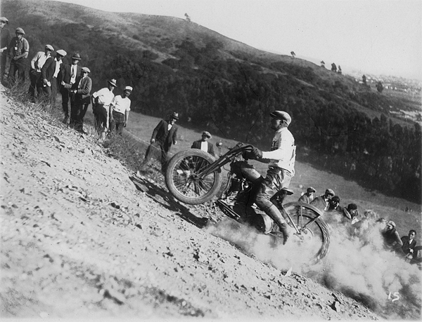 At the end of WWI, a new motorsport was sweeping across the US. Based on the simple concept of riding a motorcycle to the top of a steep hill, hill climbing was so popular that clips from recent races were shown at movies theaters as part of the preview reel throughout the 1920’s and 1930’s. The top three American motorcycle manufacturers (Harley-Davidson, Excelsior and Indian) all promoted the sport and even built models specifically for this type of racing. Soon machines with extended frames and chained tires became common as riders looked to get an edge on their competition.