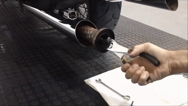 He uses an Allen key and a wrench to take off the nuts and bolts holding the baffles inside the Bassani pipes on a Road King Classic. Then, with a pair of pliers, he slowly extracts the music manglers. The H-D goes from emitting a pleasing snort to producing a sound that makes you picture Satan charging into town on the back of a hell hound to wreck shop. Click the play button to hear what I’m talking about.