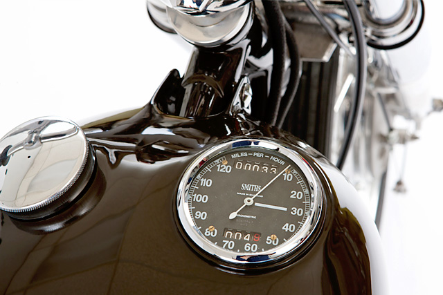 Most of the other features of the bike were fabricated by The Gasbox. The oil tank, the rear fender and the 2 into 1 exhaust that works its way around the frame and the side of the engine. The fuel tank was modified to take an old Smith’s speedometer, which helps keep the front end of the bike clean.