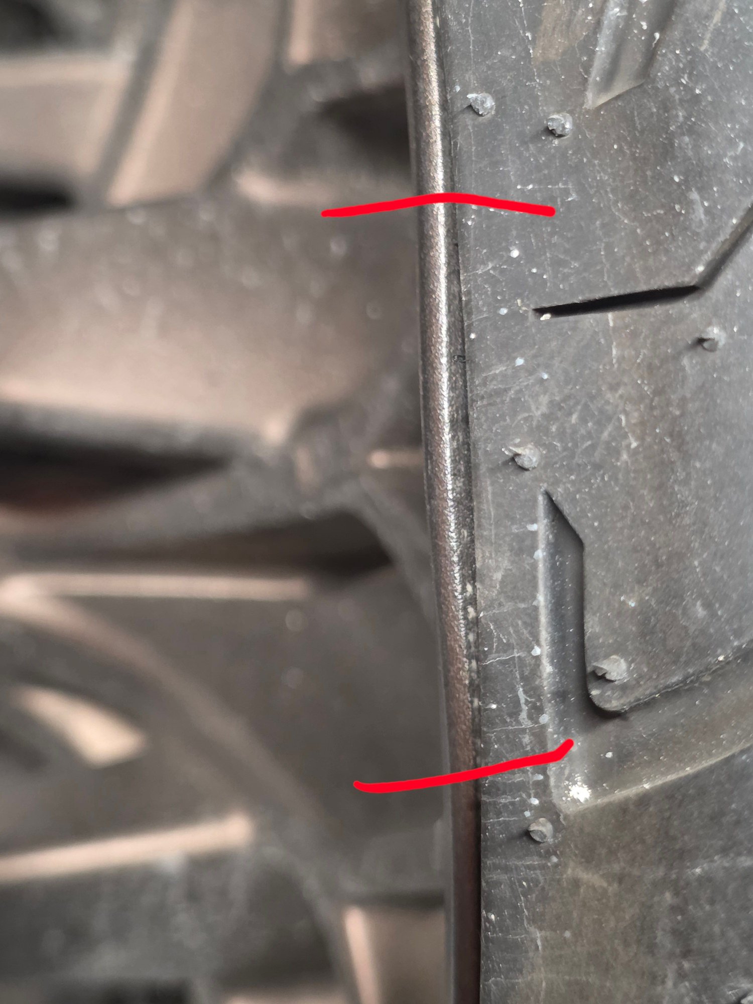 22 RG ST with factory wheels. Went to reinstall my carbon fiber fender which I had previously removed last year and noticed a bulge in my wheel. Almost like the metal has been rolled over a touch. Approximately 1.5" long, in between red marks on the pic but the area in question doesn't extend all the way to the red lines I edited in, that's just a general reference point