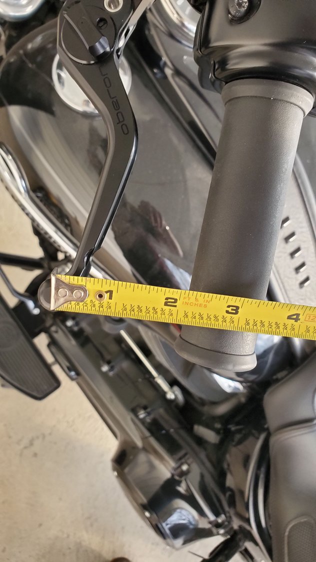 I just put the Oberon adjustable levers on my FLHCS and thought I'd share some info. The closest position, 1, doesn't quite have enough travel for the clutch, but position 2 starts to engage the clutch about 1/4" away from the grip. I have the brake lever at 2 also. I have the smallest diameter grips HD makes, but measured to the center of the bar for you.