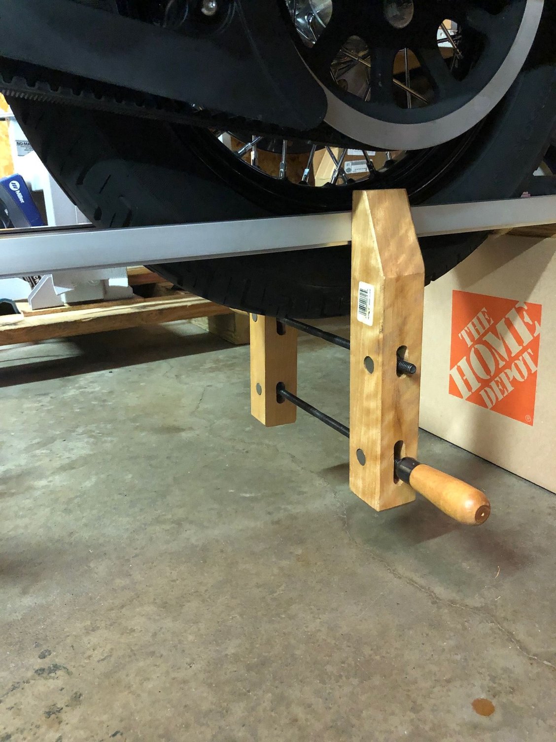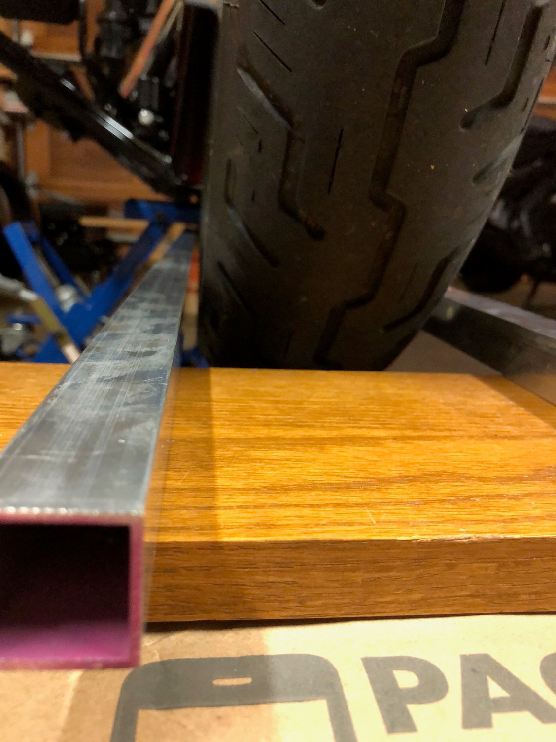 I set-up a simple alignment test using two pieces of 8' long 1" square aluminum tubing (purchased at a local home store). I put the bike on a lift and clamped the tubes to the rear tire. I added pieces of 1" angle over the tubing where I was clamping for added stiffness. I clamped it just hard enough so the clamp in the photos below would not fall off (keep the clamp jaws parallel). Then I went up front and gently lifted on the tubing to relieve any friction where they were setting on the support. I measured to make sure the tubes were parallel to each other to make sure they were properly clamped against the rear tire.