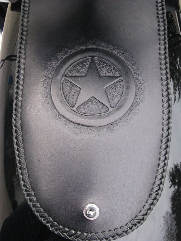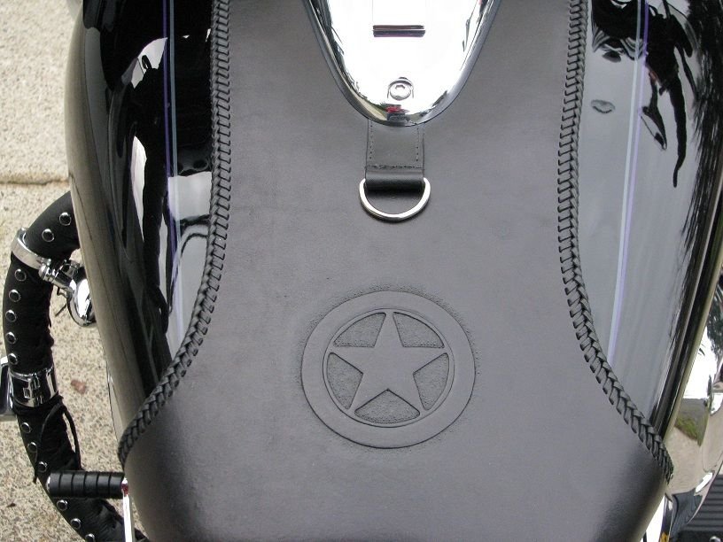 I had Chris from Three Mutts do custom tank and fender bibs for me on my VTX, using a Ranger star as the theme. He does outstanding work and is very easy to deal with. I also had him make a round piece of leather about 4" in diameter with the Ranger star embossed on it which I didn't use on that bike. I just like the design of them and figured I'd find a use for it eventually. It is now on my FB as a cover over my speedo to keep it from condensating. It works great and ironically ties in nicely with the FB logo on the tank.