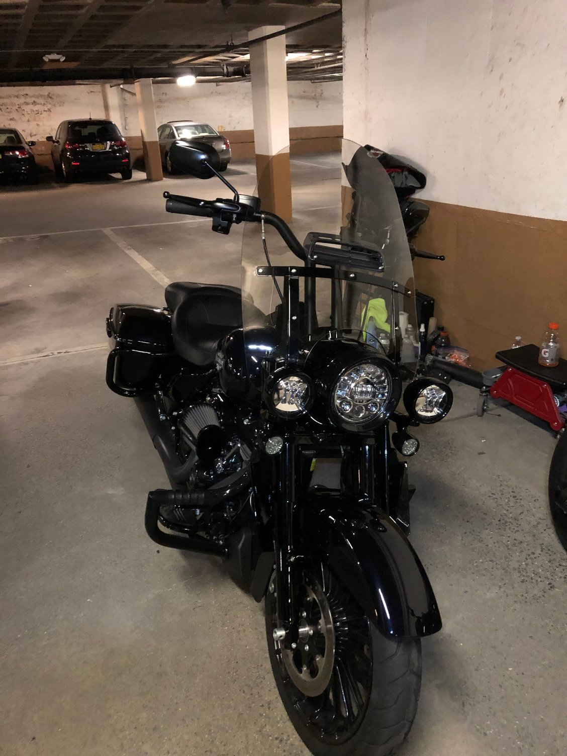 I'd have to see more of this solution to say yeah or nay (lots of blanks that one picture fails to fill in). How does angling/laying the shield back more towards the rider look on the bike? What does it do with the space between the shield and the bars (space used by many to mount electronics or windshield bags)? If you take a step back, how does the added (perhaps kludged) hardware look on the bike from the side? Could the same results be achieved by just increasing the gap between the shield and headlight (seems like a simple enough cut) as noted by Hulkss? I'm not saying it's not a workable solution, but it does raise some questions.