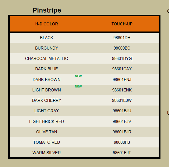 A friend send me this, 2019 Harley Codes for pinstripe, do not know this will be enough for the paintshop to make the color.but does not help very much I guess.