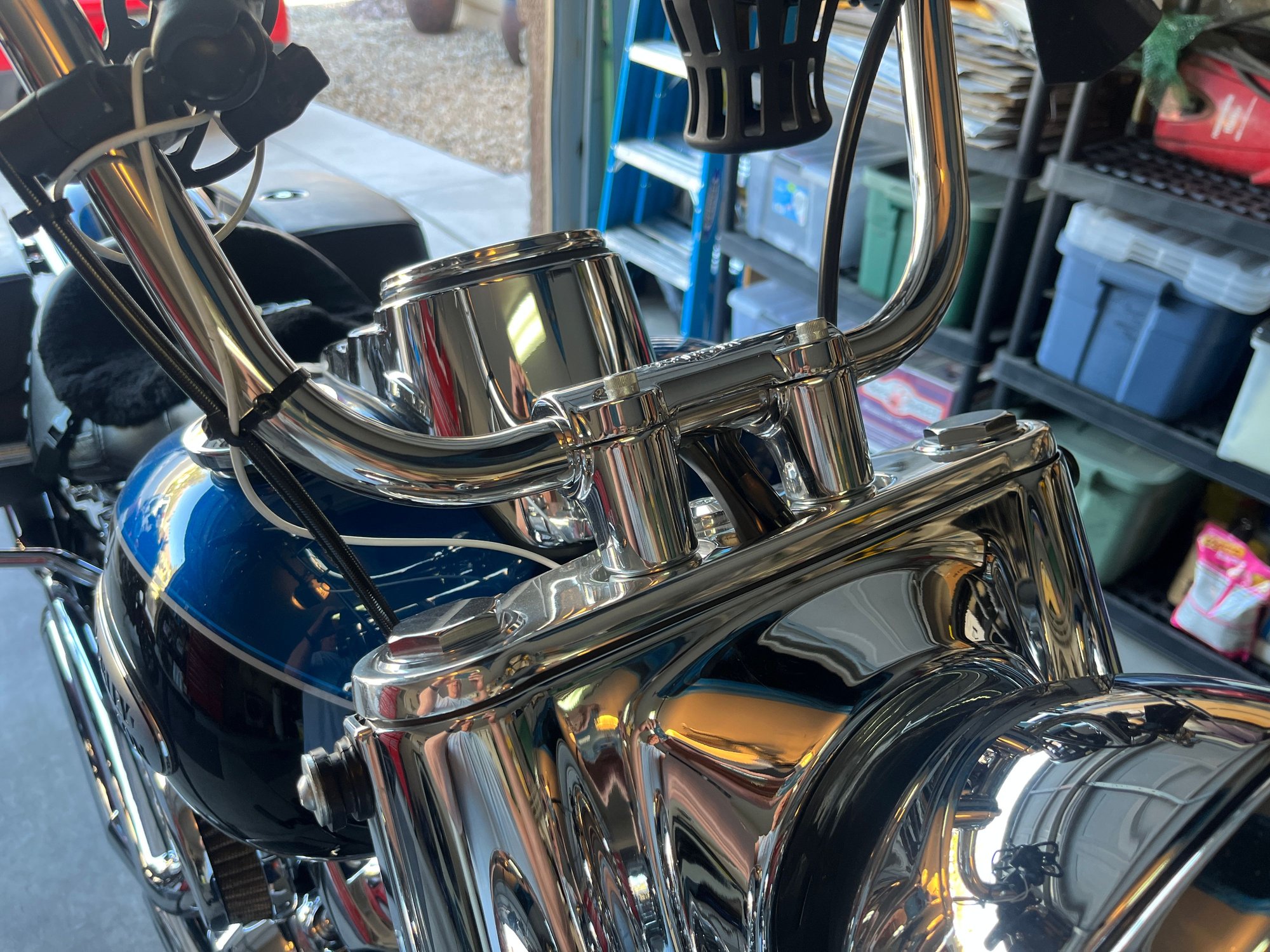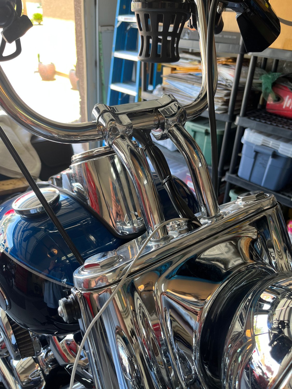 She wanted her bars higher and further back, but she really likes the stock Heritage bars. She couldn't decide after more than a year of riding this bike, so I put 6" pullback risers on it. Good for her, sucks for me... I'm all cramped riding it now. Oh well, it's hers... I just pay for it Tomorrow I'll go grab a new brake line and it"ll be finished.