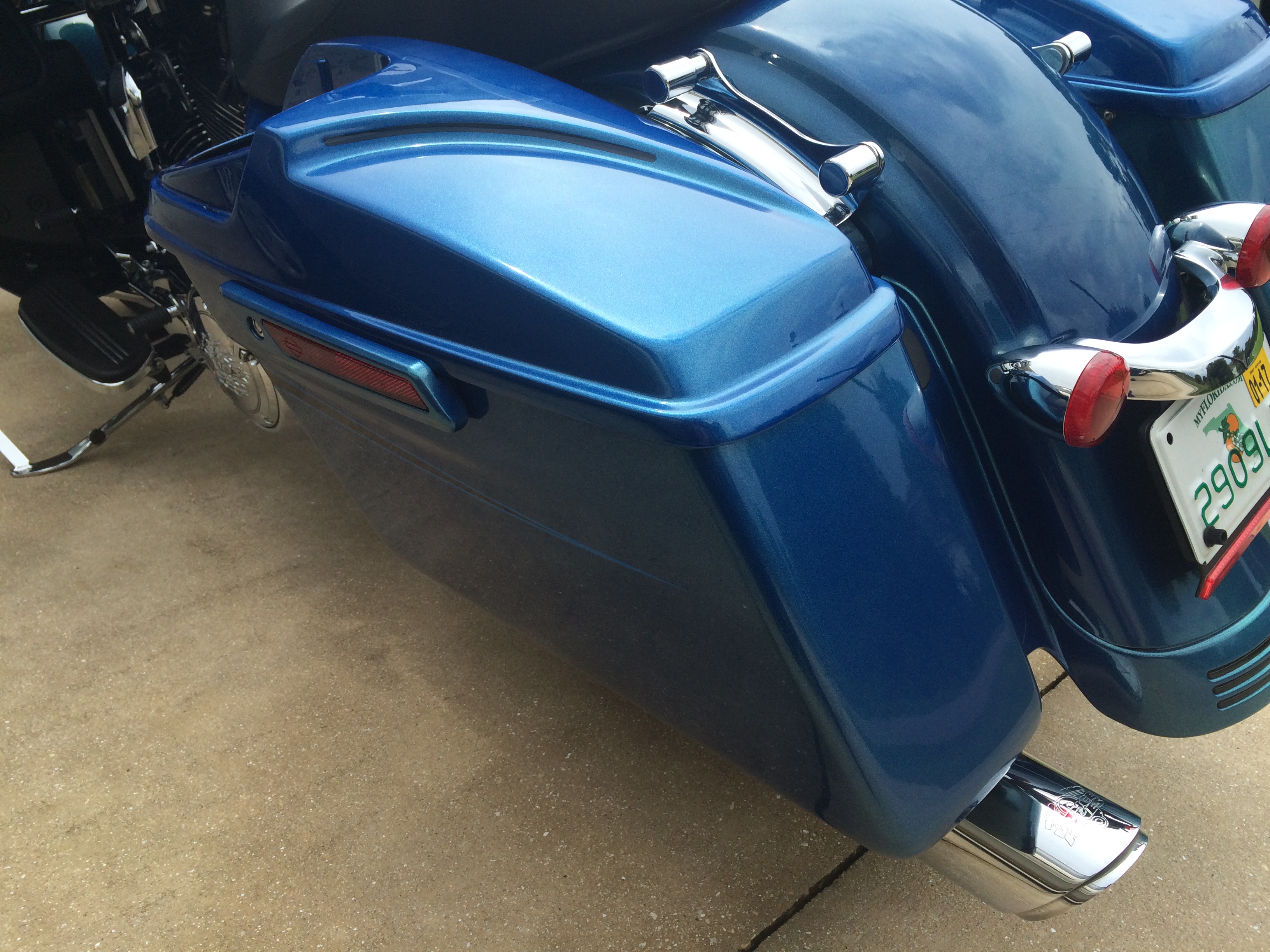 Now the bad. As with everything you do that's custom it never seems to match the factory stuff, so in one picture the lids look much more blue, in others they look the same. (Even my HD parts don't match) The painter had a side cover off the bike, inside they match perfect, outside depending on how you look it's different. The Daytona Blue Pearl has been a royal pain, it drove the painter crazy (and me), PPG mixed it wrong so they had to remix it, they both did spray out cards and it matched. Well, the costly part of this color is the actual "pearl" mixture, that's hard to match too. No biggie, down the road I'll be doing extended bags and fender so maybe I'll have the rest of the pieces painted and take the ugly stripe off the fairing.