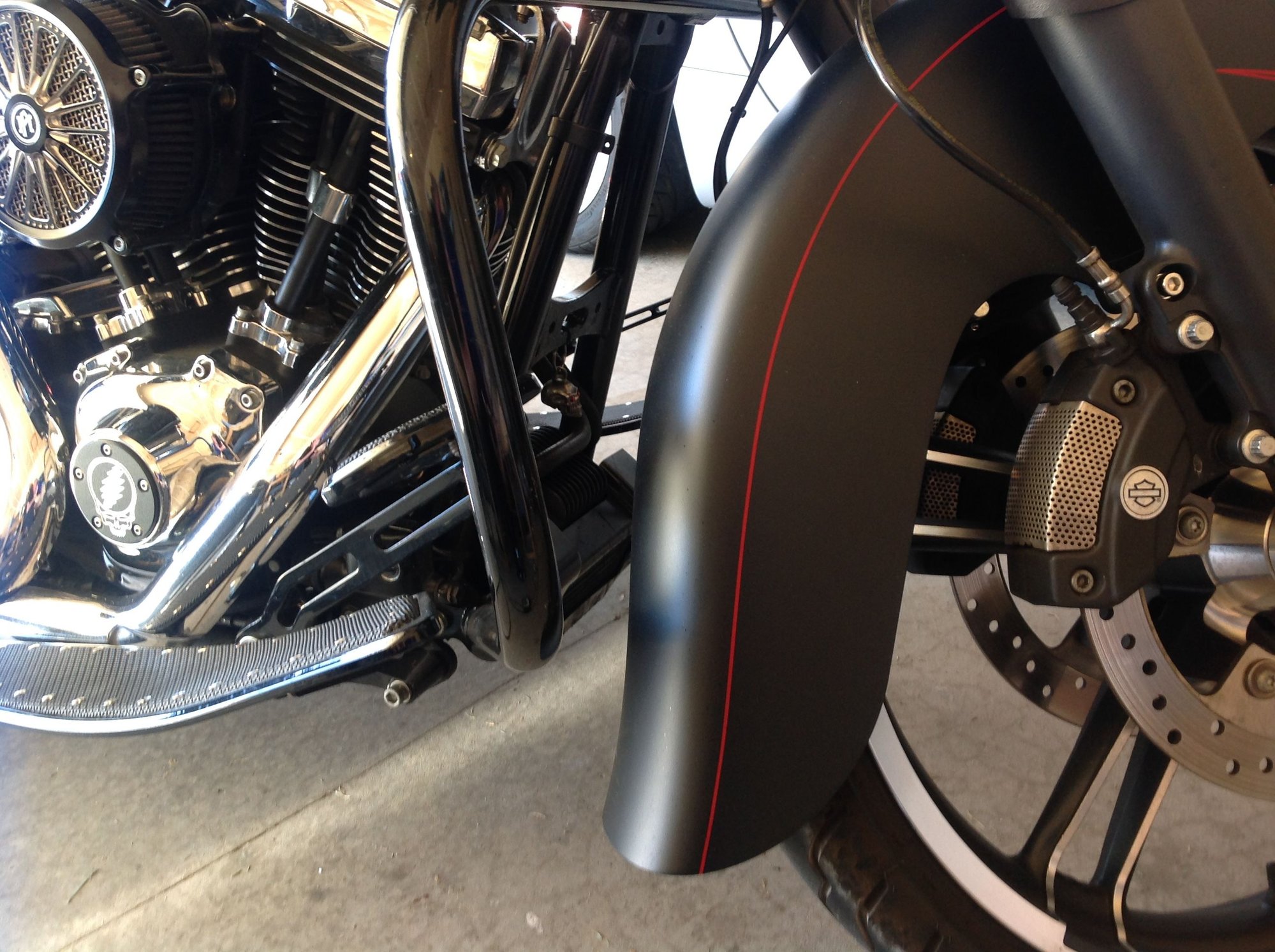 15 street glider ill check fender clearance think brake and floor boards will be ok main thing is has to be Harley stock style crash bar.