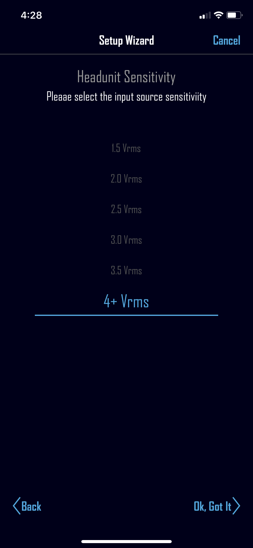 Good you are getting a handle on it. What Outkasts second question was referring to was the Headunit Sensitivity setting in the DSR1 setup wizard.If you're still feeling like you're over driving your horns try dialing back the input sensitivity. You should then be able to get closer to your target voltage on your amp gain adjustment.