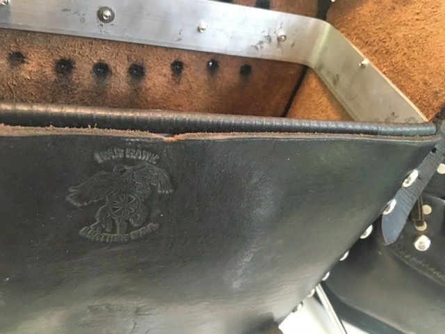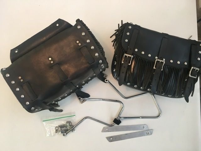 - Saddlebags with perfect chrome mounting hardware and inner aluminum frame. War hawk leather (whatever thats supposed to mean) brand. Thick leather with brown tinge: $350