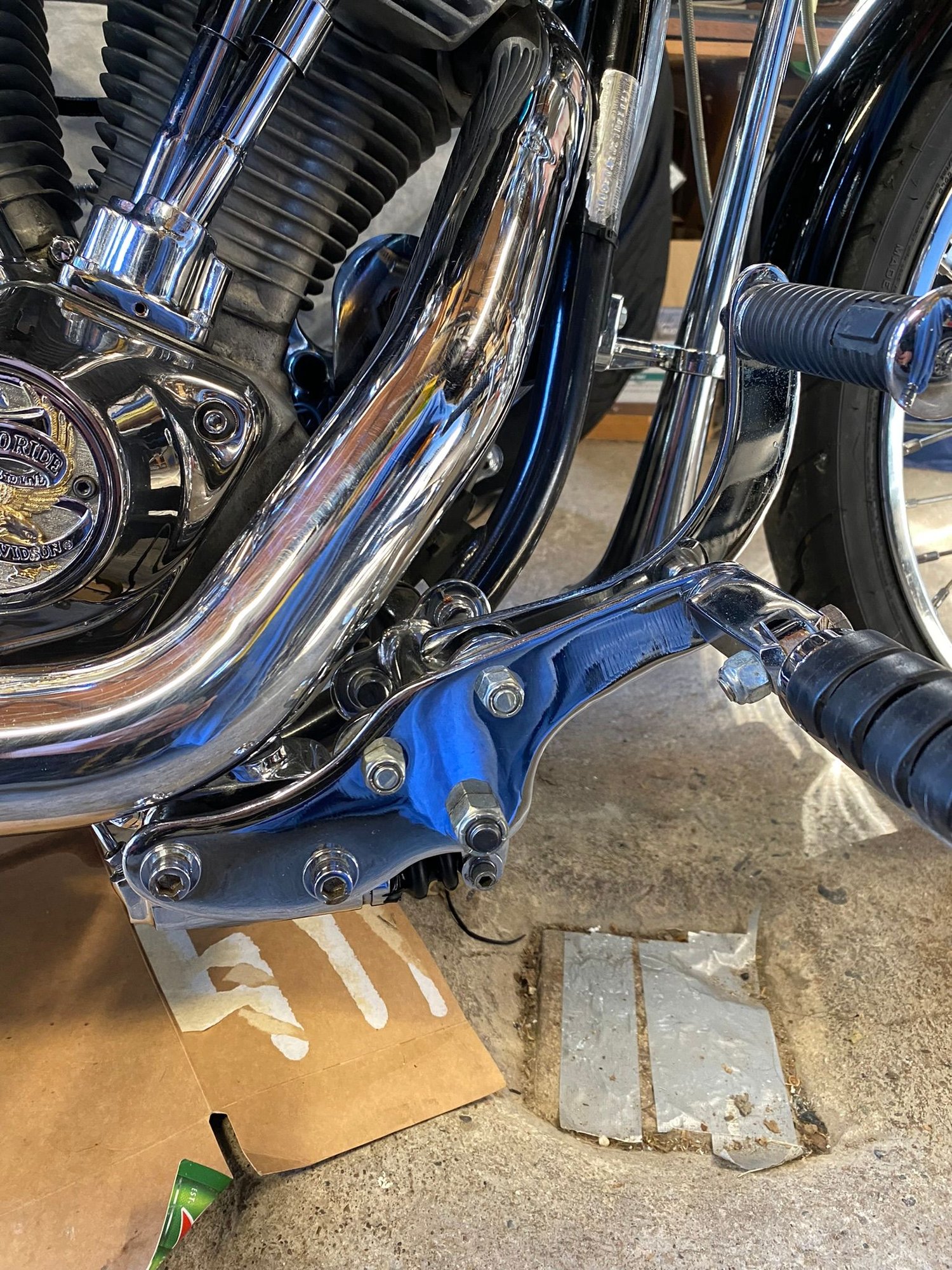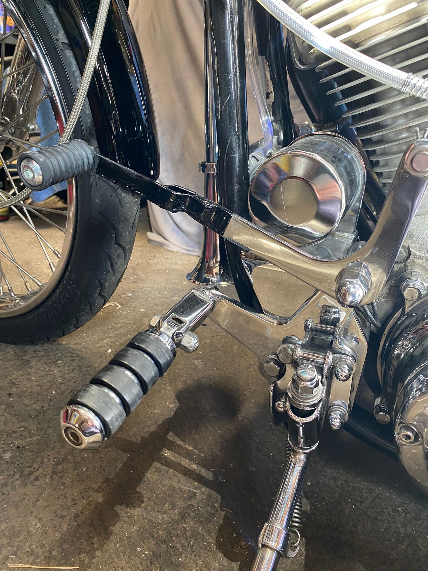 When he said it had 16" apes on it I thought to myself they had to go immediately. I put new bushings in and adjusted them to where I was comfortable with them for now. Hands are at just below shoulder height. What I am trying to figure out right now is what I am going to do with the foot controls. I have a 30" inseam and even as low as the bike is I am almost stretching for the controls. Not comfortable.