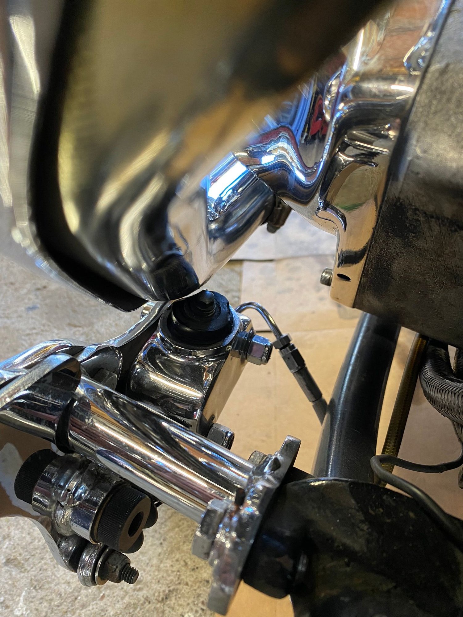 Had trouble starting it the first couple of times but it has been sitting a while. Tank looks clean but while I was in the process of siphoning the out old gas I noticed some soft white flakes. Wondering if this was the inner coating peeling off? Braided clutch and brake cables to go with the 16" apes. Throttle cables look like they need to be replaced but I'll probably just lube them up for now. Rear rotor is worn pretty good, haven't pulled the calipers yet. Handlebar bushings need to be replaced.