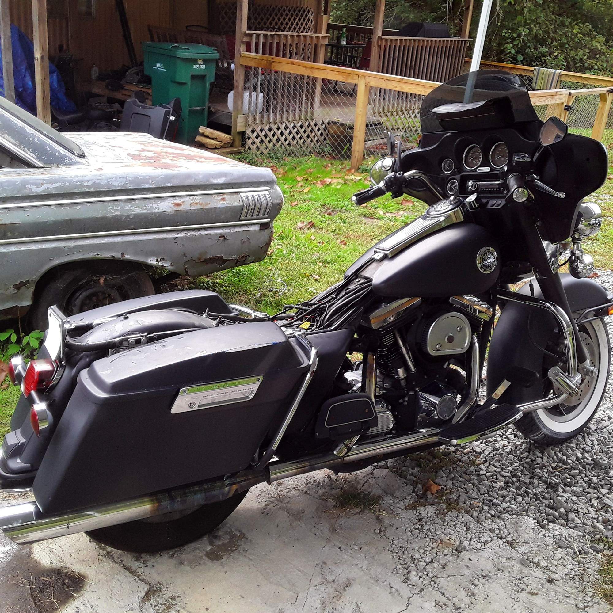 She had two minor cases of road rash, on the fairing and one saddlebag lid and a bent crash bar. Very minor bend in the bar at that. Because it had been repainted in that gawdawful flat black (poorly done I might add, they painted the tins, motor, chrome and all, it was considered "custom" and insurance totaled it. Frame was perfect.