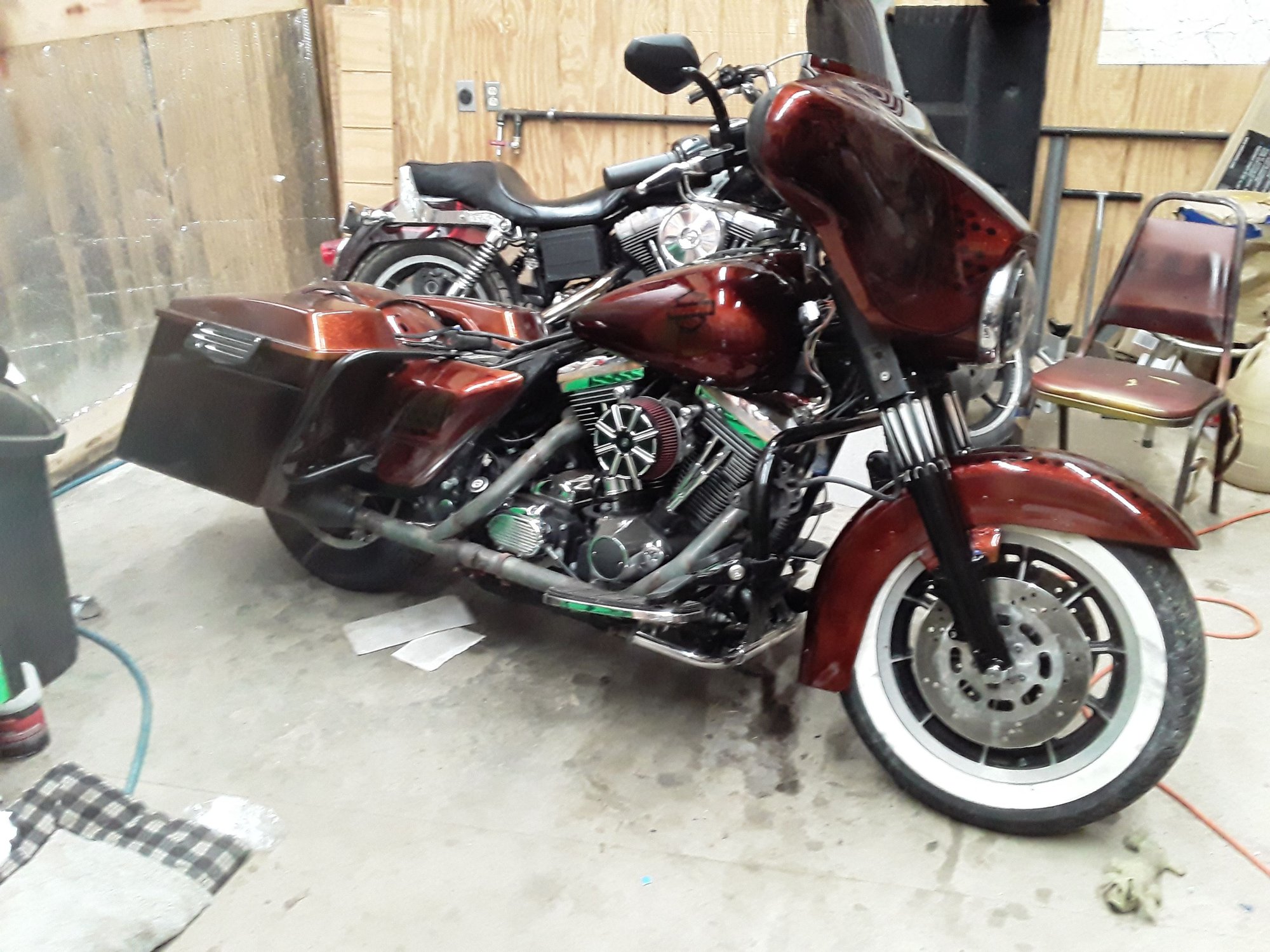 Last fall I purchased an insurance total ultra with minor cosmetic damage. I'm thinking the insurance company totaled it because of the stupid paint job that it had. Anyways, I have a few Harleys but I'm getting older and wanted some comfort. I can never leave anything alone so I figured restoring an insurance total would be the ideal opportunity to make "My" perfect bike. It's an EVO which I consider a great motor and plenty of power for my 70 year old butt. 26,000 miles which is a plusbut it has the MM fuel injection which I know nothing about but seems to run fine. It has a power commander 5 and I'll figure that one out. I've replaced or upgraded everything but the tank and fairing in the quest to make her mine. I did all the paint, the powder coating, rebuilt the front suspension, install a bunch of glitzy bull crap but I like it.Another couple of days and she'll be ready for the title inspection.
