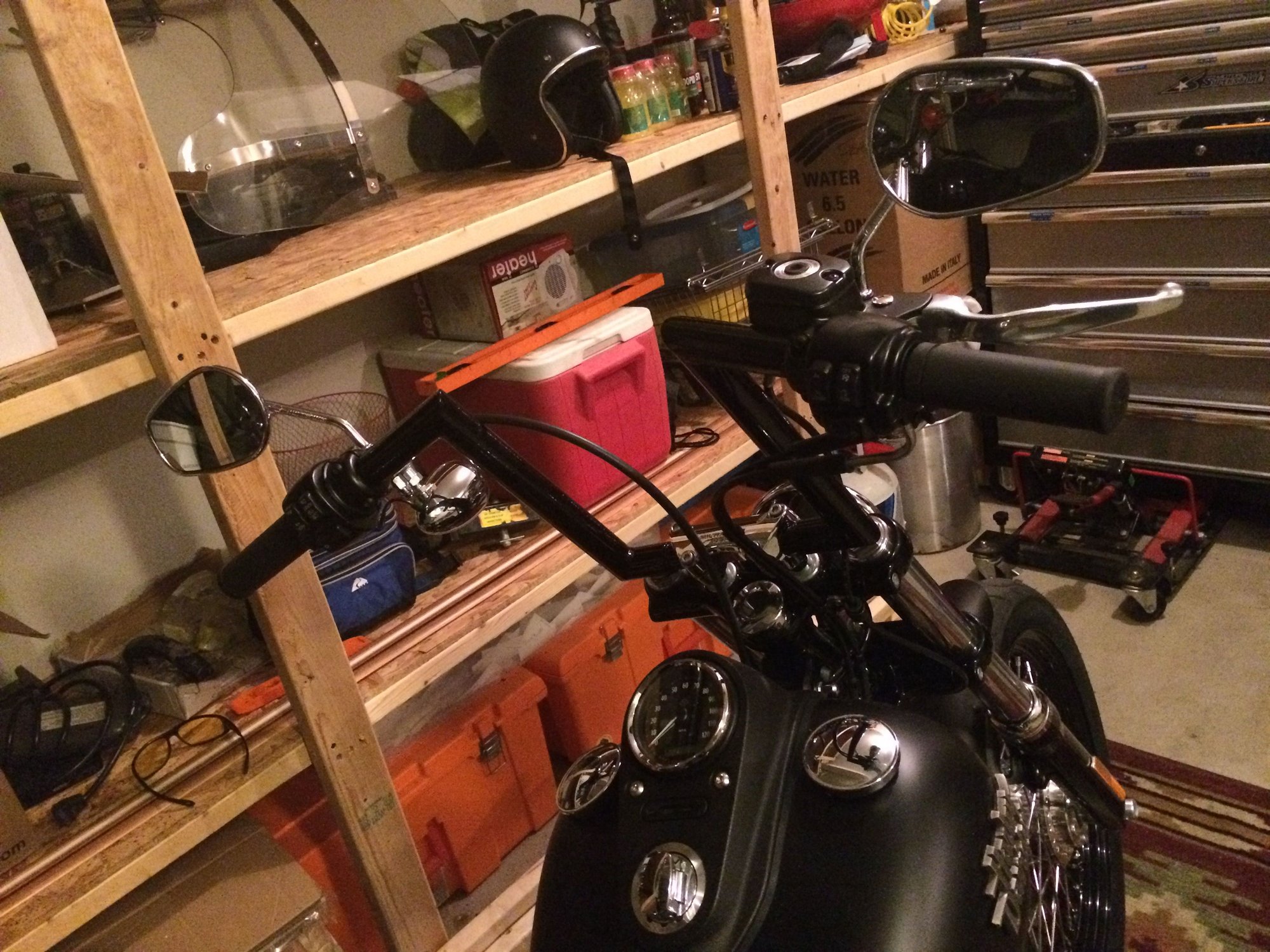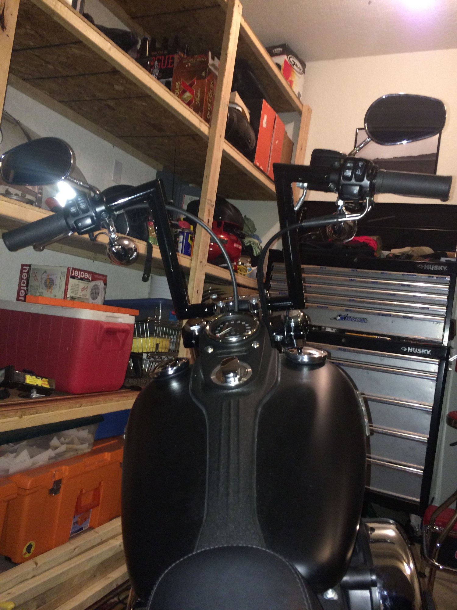 Not a bad install..... wires pulled easily.... Had one of the pins get stuck in the AMP connectors for the wiring, but I just finally tugged it out along with the plastic guys holing it in. Gonna have to ride to get a feel for bar positioning. The bars are 12' in case anyone is wondering, and ALL of the stock cables and wiring we absolutely perfect length. First mod out of the way, next step.... burly slammer kit, it looks bored in the box!