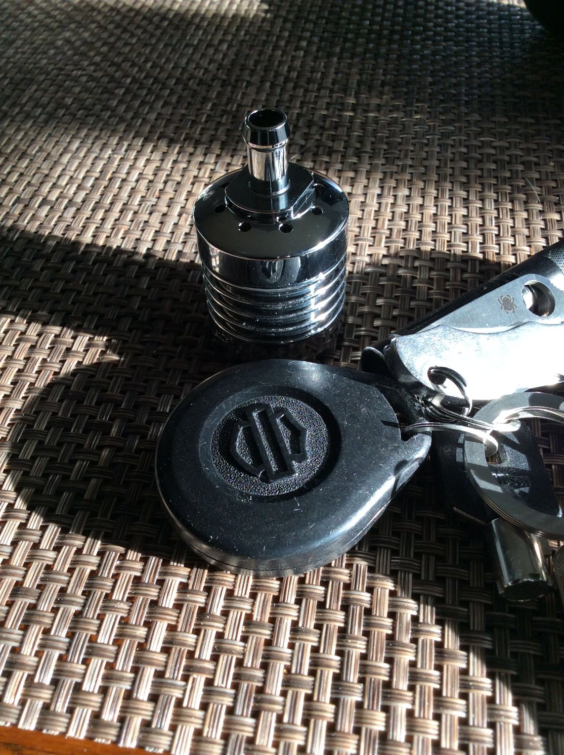Ordered this blind, with no reference to its size and when it arrived I thought, wow, this is the worst $40 I've spent to date... Then thinking about it, I realized, how big does it need to be? My plan is to hang it from the Y fitting under my modded 'Ness AC in place of the little two ended filter currently there, which occasionally drips and splatters on my rear pipe. Check it out. HD alarm fob is all I had handy for size reference...