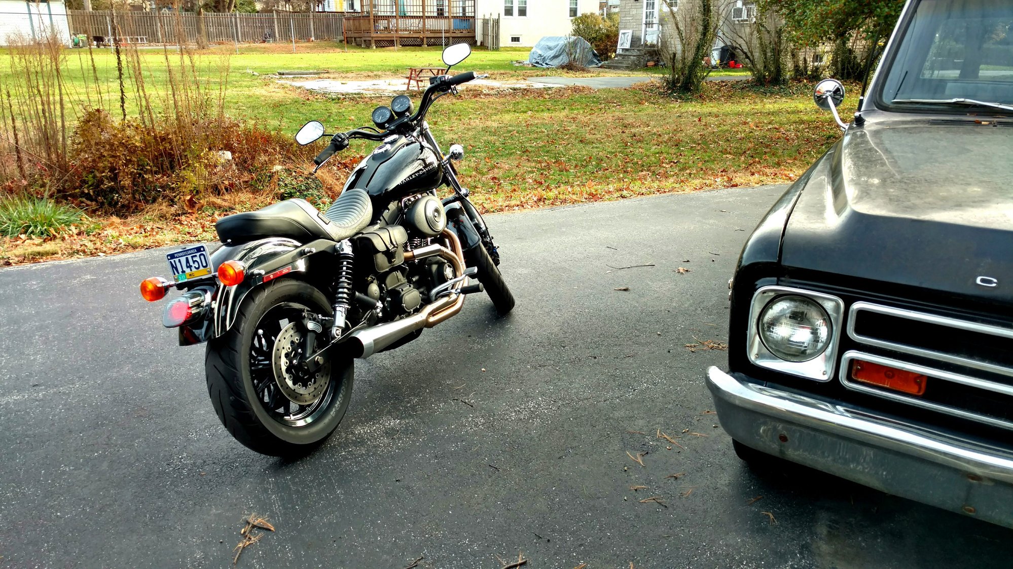 The FXDX felt great though, and clearly enjoyed the cool dry air. It was actually a really nice ride. Now they're in the garage, the Triumph up on front and rear stands, the FXDX with tires inflated to their max, and a battery tender connected.