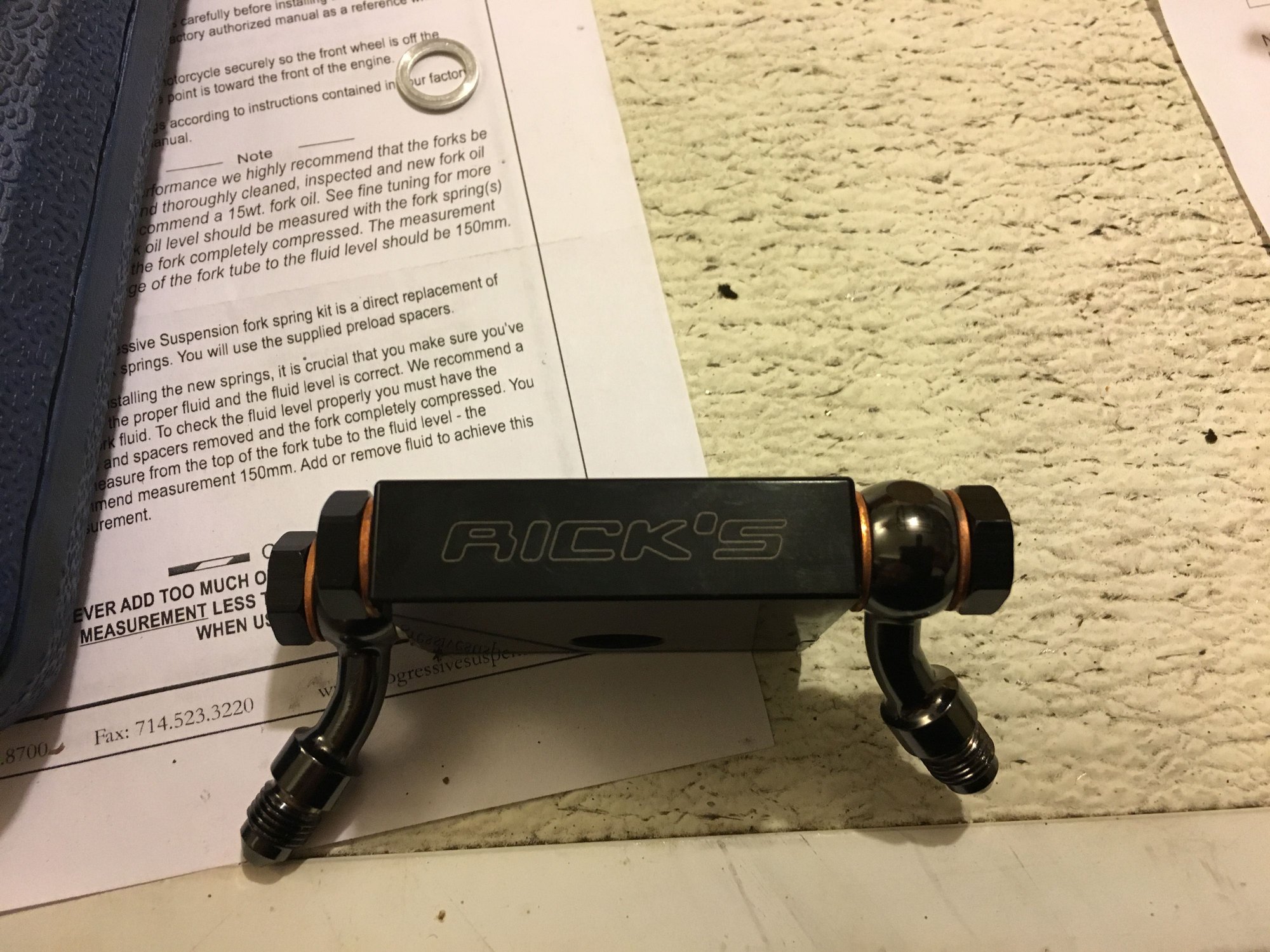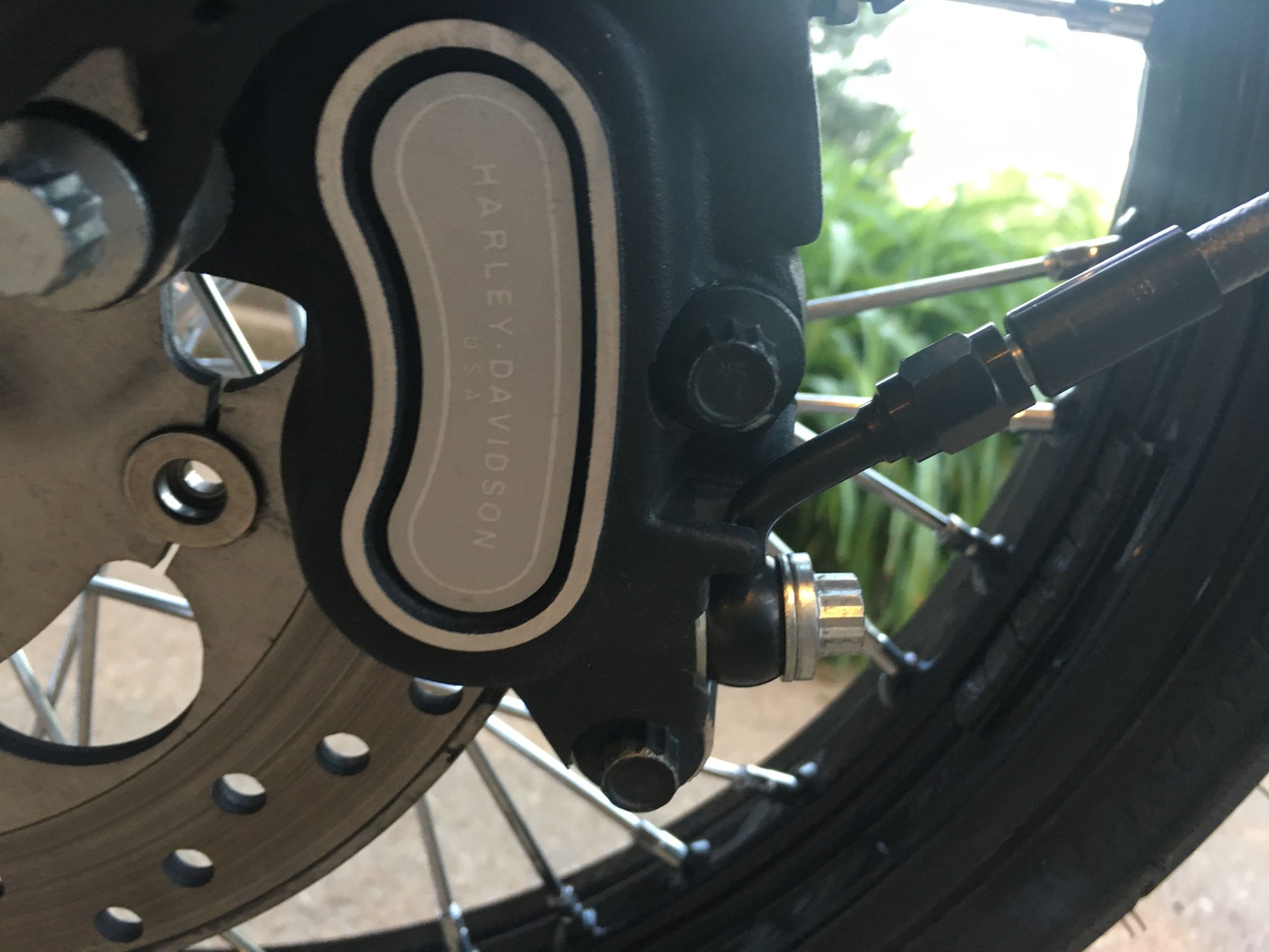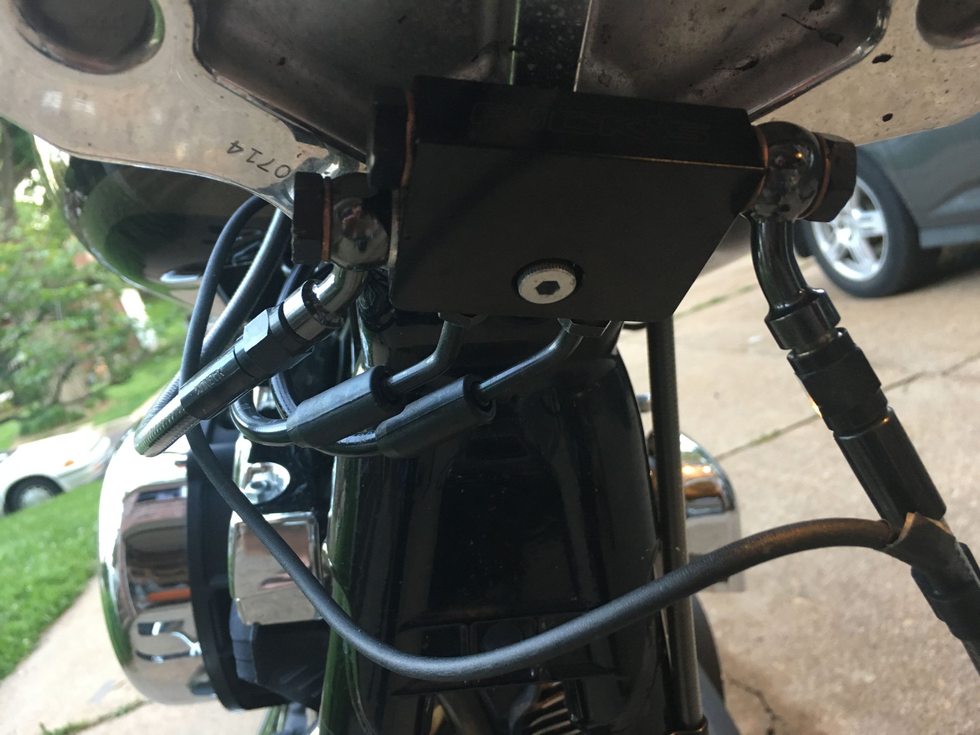 So now I have a very modular brake line setup. I can change bars and only change the upper brake line inexpensively. I can put longer fork tubes on (and I have) and only need change the lower brake line and because there is no manifold block attached to it, it's inexpensive as well. I can easily go dual-disc if I like as well. The downside is that the solution I came up with is more expensive than a pre-packaged Magnum or Burley kit and takes a lot more thought into the build-out. I had to figure out banjo fitting angles that worked well, cable lengths weren't anything I could just go look up at a website. It all required a lot of trial and error, and I have a box of expensive fittings sitting the garage to remind me of it.
