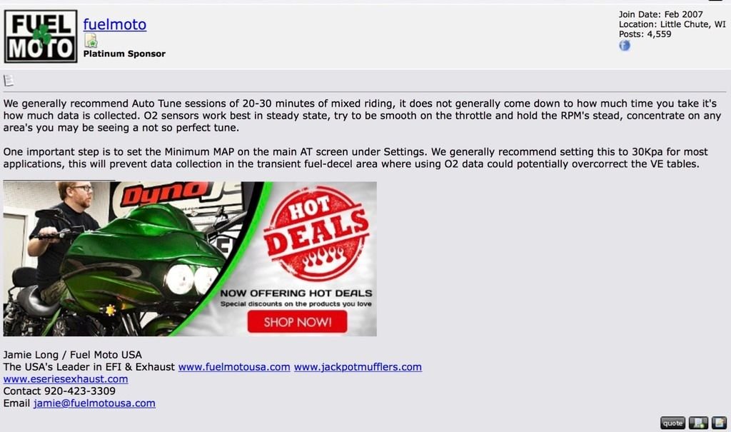 When it comes to auto tuning set the minimum MAP to 30Kpa to prevent data collection in the transient fuel - decel areas. Set up the auto tune run so you can see the data hits; when a fuel cell goes red it has collected the maximum amount of data for that auto tune run...