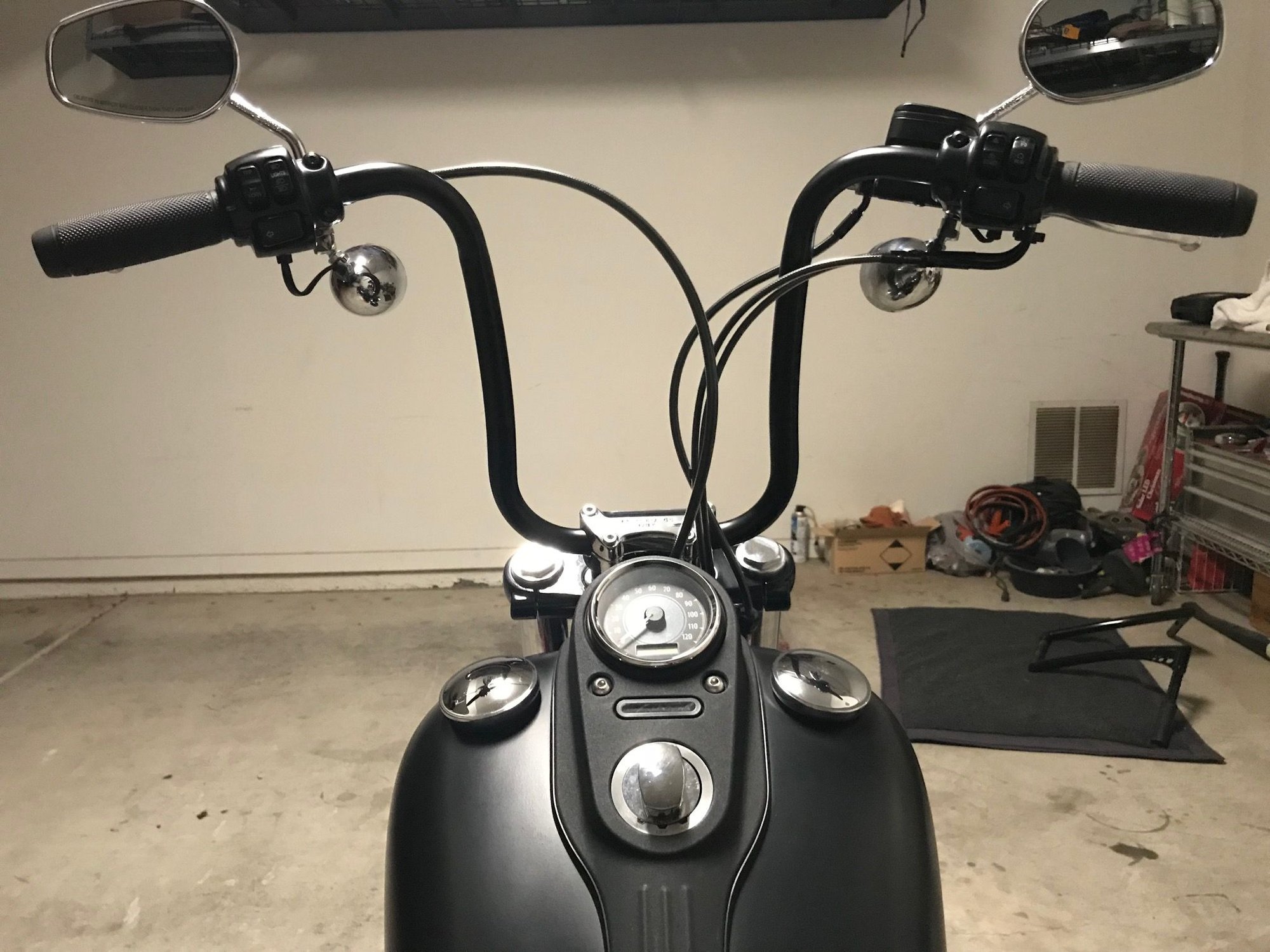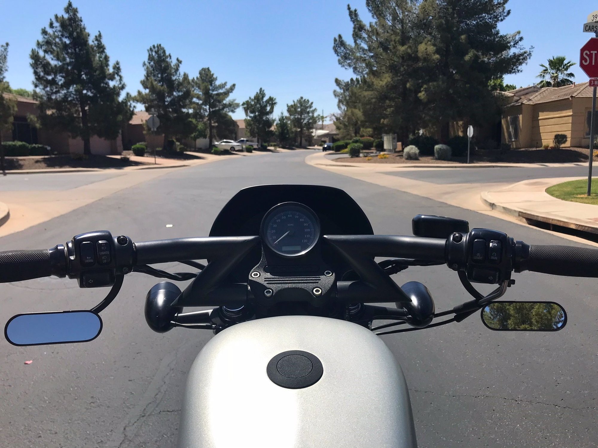 I had them under on my Sportster with the tiny oval mirrors. First ride, I told my buddy "I can't see sh*t with these!". Fast forward a few rides, I never thought about it again as I got used to it and got the angles correct. My new street bob has them up top, first time I rode it I looked for the mirror to change lanes and couldn't find it because it was so high up there! Once I swap out the turn signals, I will be putting them underneath strictly for looks to clean up the front end...I'll get used to them wherever they are. Picture of my SB was right after switching bars, so the mirrors and signals are not adjusted, hence the throttle side looking all cockeyed.