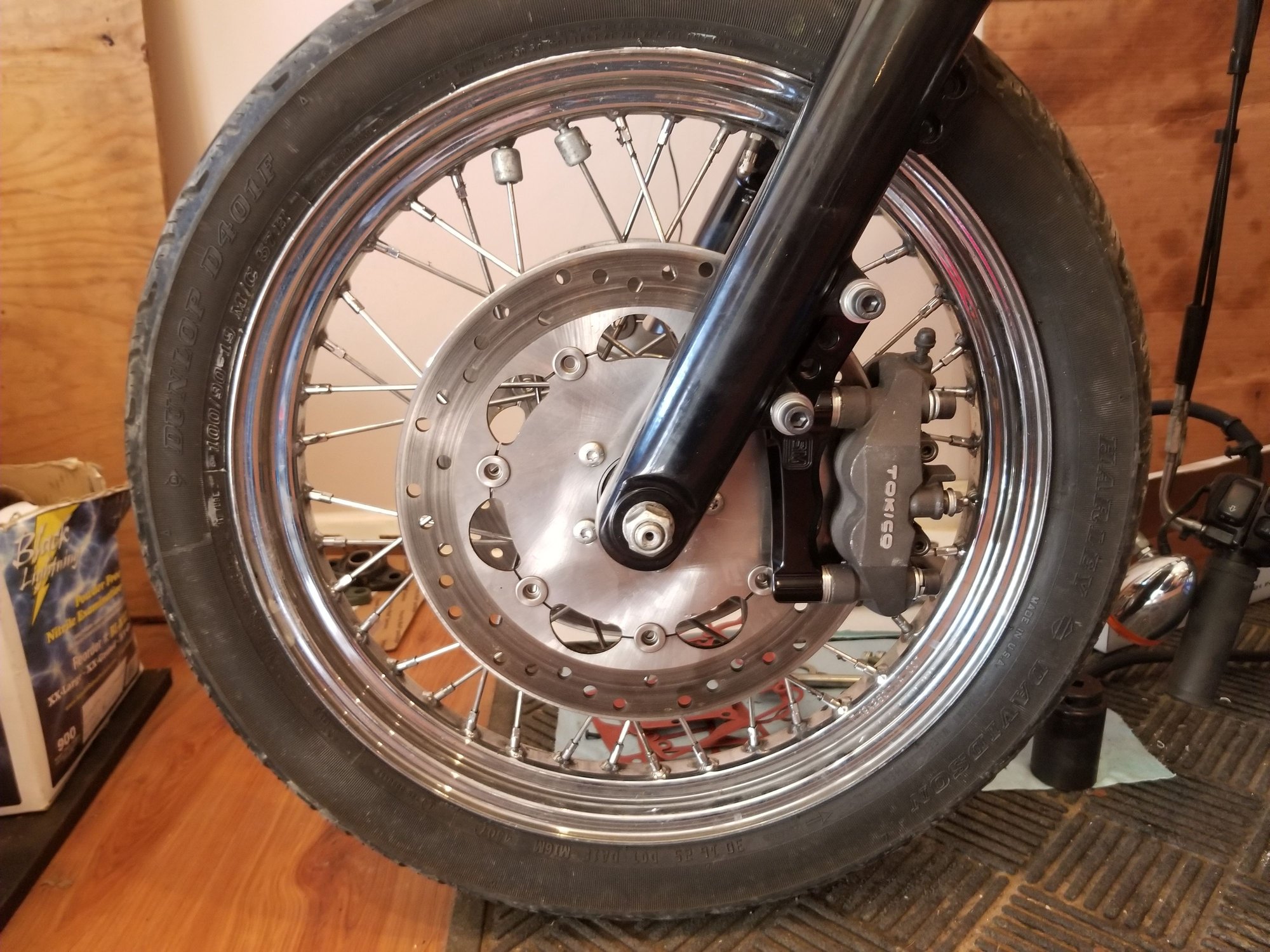 Speed Merchant radial brake mount & Tokicos. Can't see it in this picture but this bike now has twin disks. Rotors came off a Fat Bob. Still have to run brake lines...