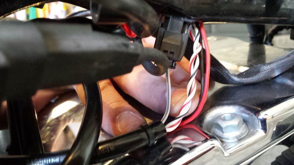 Next on the FXDL you have to deal with the control wires that run through the headlight cover. Whatever your Dyna you're going to have to unplug your wires from under the tank, inside the backbone.