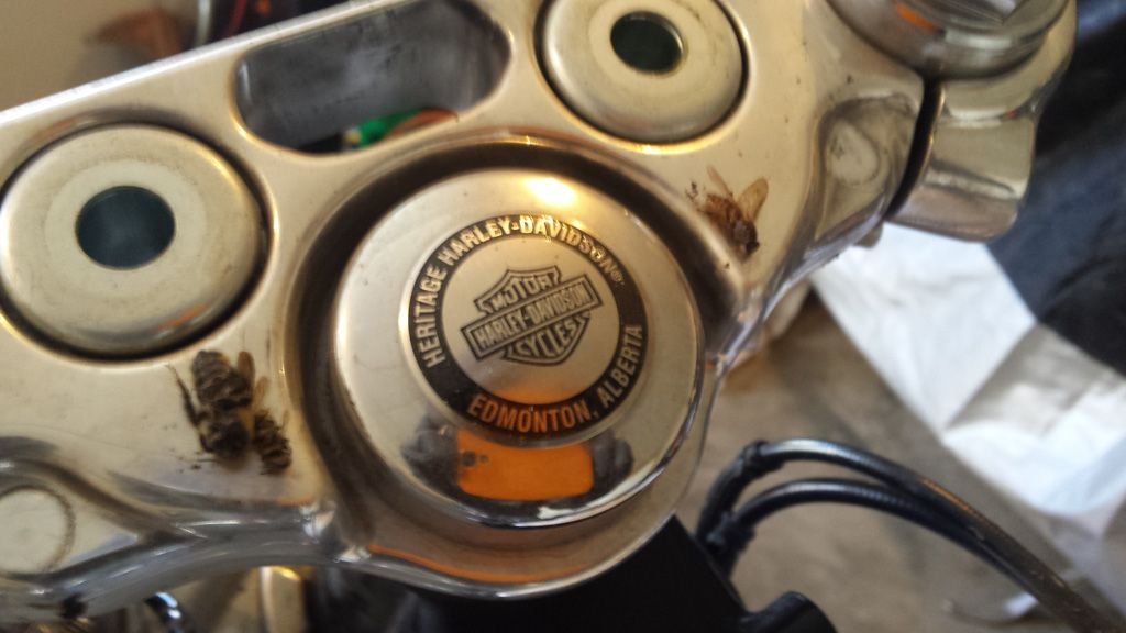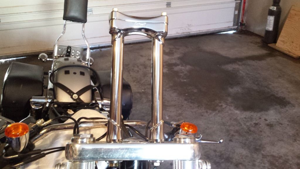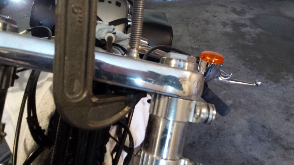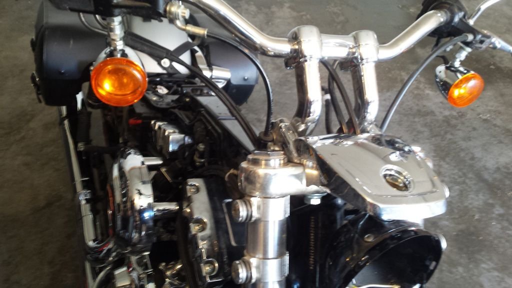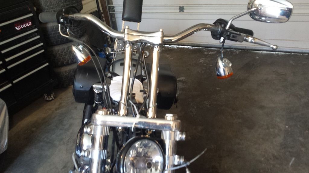 I put my bars back on. Not torqued yet just snug. I had to remove my clutch and brake because the lines were too short. The signals are ready for clipping and relocating. My setup works out to be 12.75" of rise. I ordered a cable kit from my local speed shop for 12-14" bars. I'll post that when it arrives. You will have to remove your clutch release cover, and in some cases you will have to pull the exhaust to access the cover. I only had to pull my shields, but I did go and buy a set of extended hex sockets. I'll post all that showing the cable install. My dollar store headlight bucket is zipped tied on, and I'll show the bracket build asap.