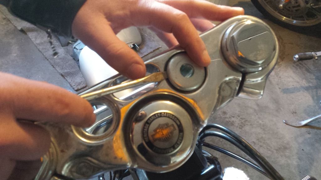 If you're installing polyurethane riser bushings do this step. Some say you need to installed hard bushings, some say you don't. They're cheap and make for a firmer grips so I installed some Arlen Ness bushings. Pick the riser washer off, and push out the two part rubber bushing.