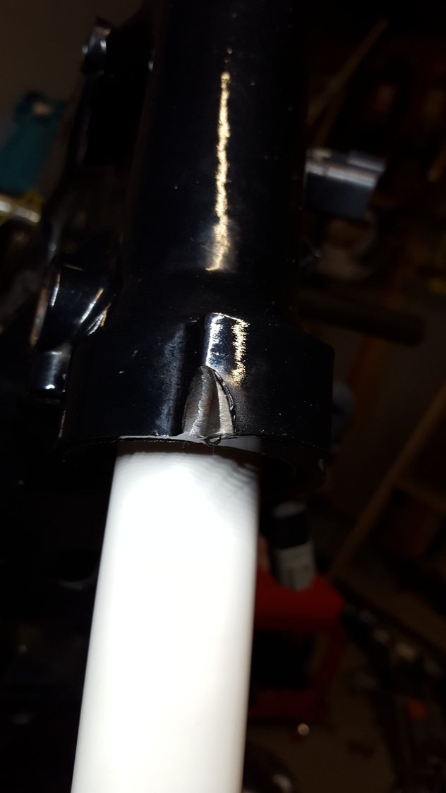 Looks like the triple tree post banged into the frame stop hard enough to bend the post over and take a chunk out of the frame stop, as shown in the attached pics. I also include a photo of the intact frame stop for comparison. Eyeballing the steering neck for level To check the steering neck I