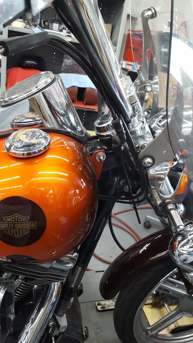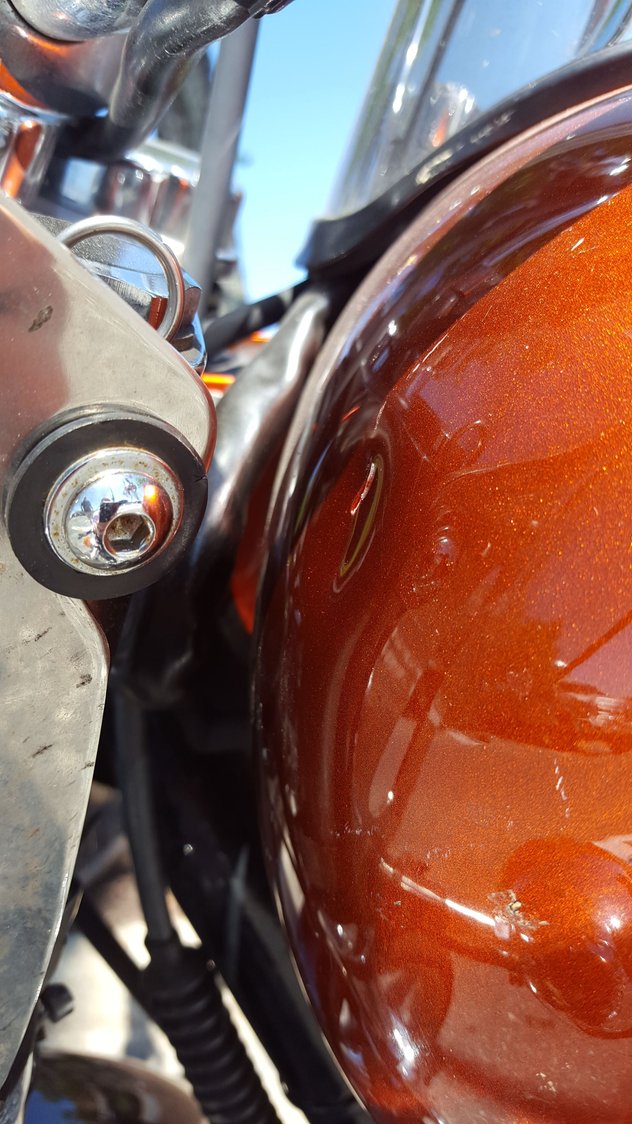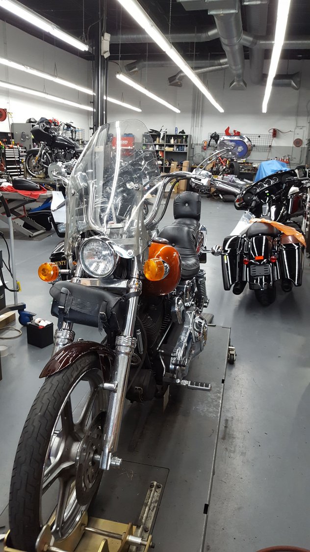 Posted about this in another thread, but my 2000 FXDWG was struck from the front in a parking lot hit and run. The impact twisted the forks such that the wheel is about 20-30 degrees from straight. Strangely the bike was not knocked over, but was pushed about a foot or so judging from scrape marks on the pavement made by the kickstand and front wheel. Dealer did the insurance estimate, the repair # came in well over the book value of the bike so insurance totaled it. I bought the bike back since part of the estimate included a bent frame, and I'm not so sure it is. I don't see how pushing the bike, even hard enough to twist the forks in the triple tree, could damage the frame, and I found no obvious evidence of it, i.e. no cracked welds, flaking paint, scuffs, etc. The insurance adjuster said the Harley mech was 100% certain the frame was bent. How could he tell? The bike was not disassembled so far as I can tell, it was all an eyeball inspection. There is a dent in the gas tank, but it appears to me the impact was made by the corner of the detachable windshield bracket, an after-market add-on, not the triple tree. But that's irrelevant at this point. Does anyone know of any easy method, without pulling all the components off it, to determine whether the frame is in fact bent? Thanks.
