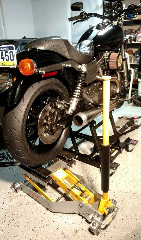 This is a great idea, Chris! Whether front wheel or back, I always lift the bike on the J&S lift, then I use my old Sears jack to raise and lower the wheel. It keeps both hands free, and it's easy to make small adjustments with the jack.