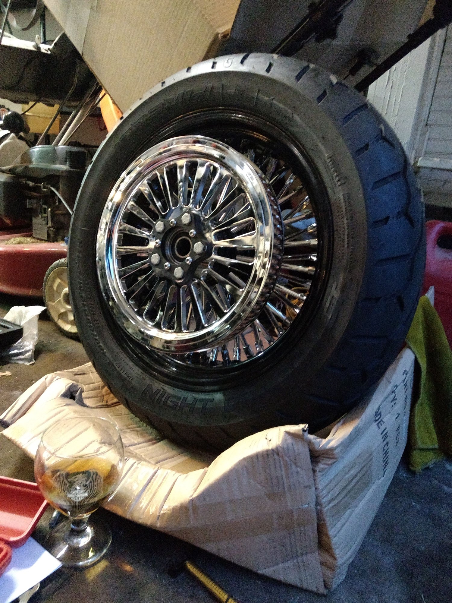 Went to assemble and it was a PITA. So with the 16" x 5.5" I had to try several different procedures to get everything in place before inserting the axle because the caliper doesn't slide between the rotor and the wheel hub when the rotor is already installed. What I ended up with for procedure was to roll the wheel in, put the belt on the pulley, get the caliper positioned and held up with a string to the sissy bar, get the left side spacer positioned, slide the rotor in between the caliper and the wheel then slide it in to the caliper, slide the caliper and rotor as far back as they could go and roll the wheel forward a bit so that I could get the right side spacer in between the caliper and the hub, slide the caliper and rotor back in place, then bolt the rotor to the hub. That was just to get it in place. It was tight and no fun to get the axle to slide in but now that I know the order it should be simpler. I checked alignment, runout, and spun the wheel a bunch to see where the belt was going to run on the front pulley. It is closer to the outer face but still about 1/8" from it so that is good news. Bad news is I noticed some belt damage when I was spinning the wheel. Not enough to necessitate an immediate change, but I won't be gunning it or traveling too far on it before I can get it changed out this winter. Overall I like the new look, the handling due to the wider tire and slightly lower back end will take some getting used to, and I look forward to getting the front wheel replaced so that it matches once I wear out the front tire.