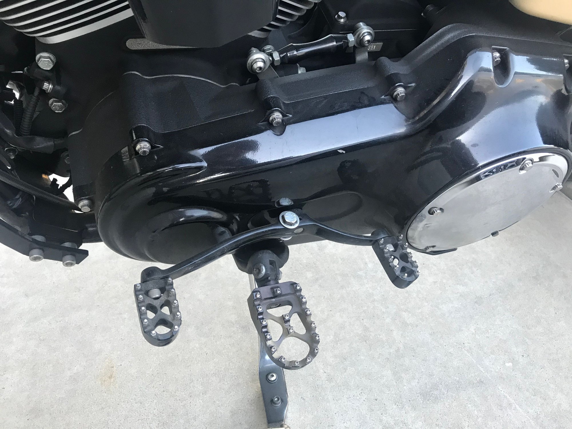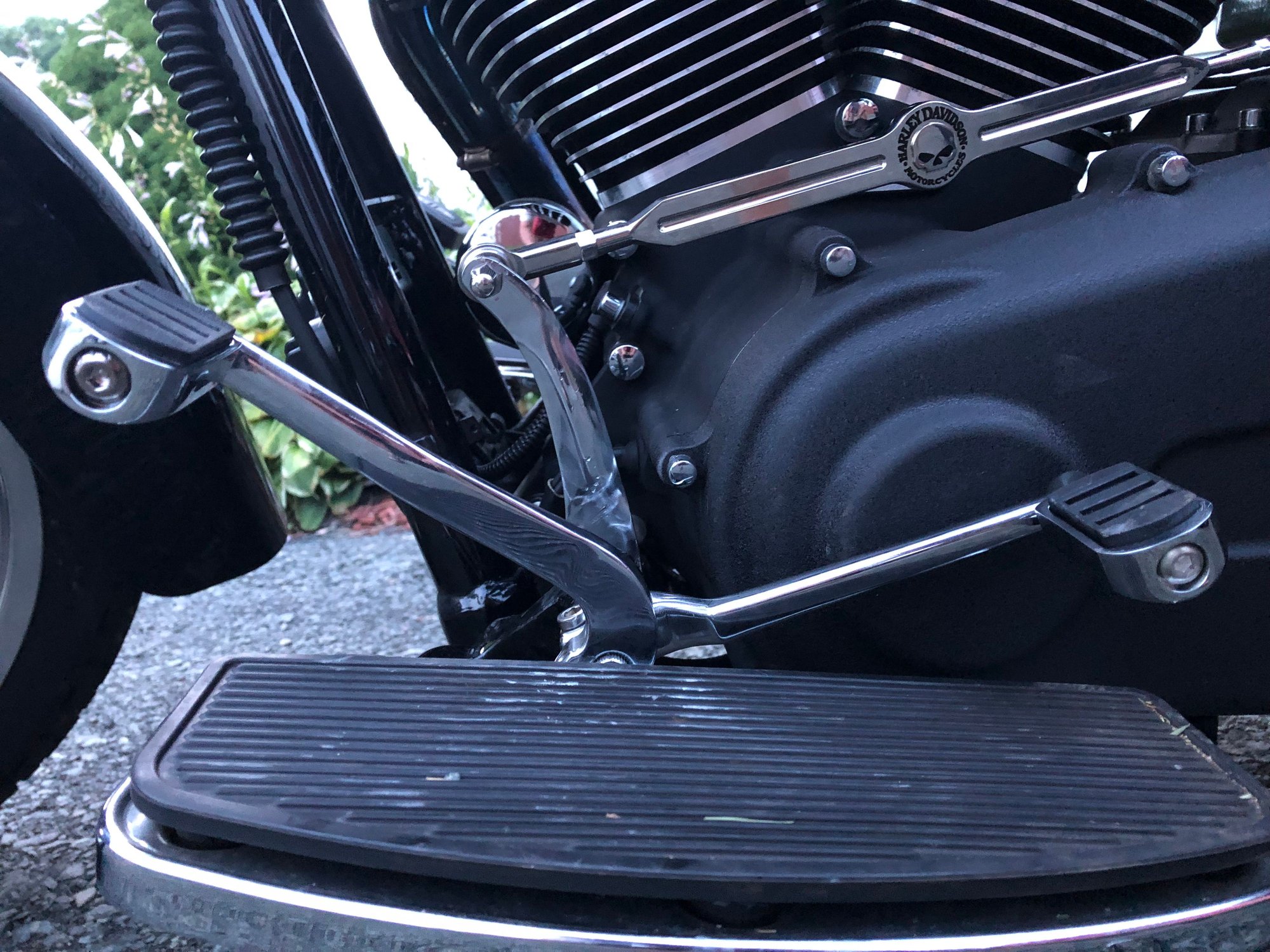 On my 2000 FXD I used a transmission shift lever and welded it to the oem shift lever that came on the bike. I plugged unnecessary holes with some grommets from Lowe's. Originally, I had a heel hammer but found that there wasn't enough leverage for heel shifts and this setup leaves enough room for my boot heel to fit between the peg and the lever.