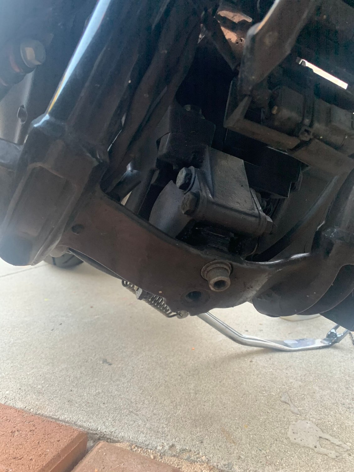 EDIT: if you look at the piece that the screw goes into, that's the front motor mount. Above it there is a bracket attached to it, and that bracket attaches to the engine itself. Where the bracket meets the engine on the right side (of the bike, not the picture) doesn't look quite right. It looks misaligned. Probably nothing though but have a look at it, doesn't look right to me.