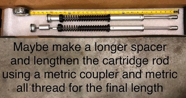 All is needed is to measure the length of the rod on the bottom and make/machine it fit to the right measurement to work. Machine a new damper rod that is longer. Re-valve the fork to work as I re-Valve everyone myself so they work. I did the "English" Gent bike when these cartridges just came out and he had already purchased the top 41mm triple tree from Due Engineering. With the parts & forks here, it is much easier. Kiddy Garden stuff.