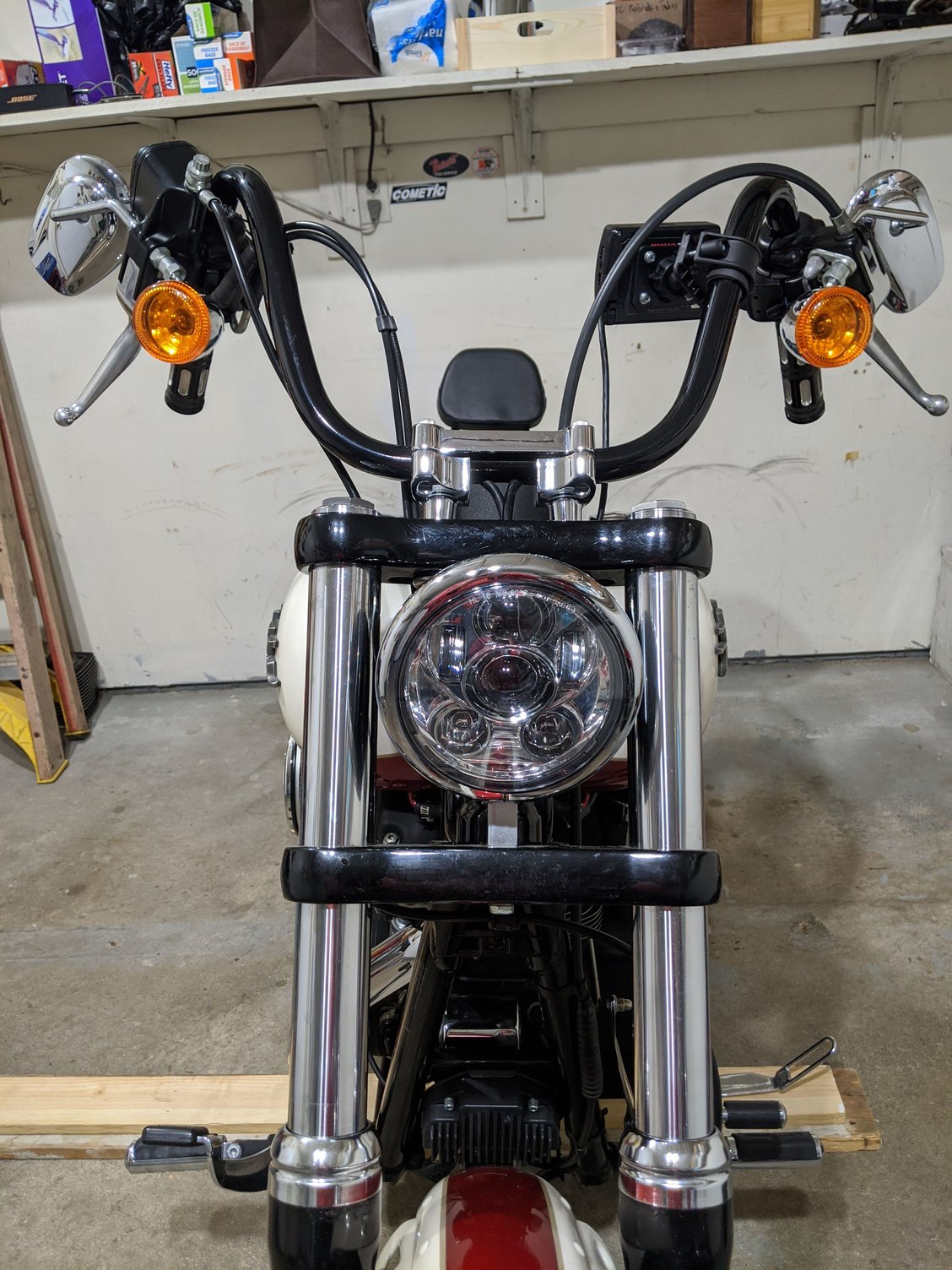 I picked up my bars today and was able too get them installed as well... I can't wait to get out on the road... They feel very comfortable just sitting on it in the garage... Well see how it does on the road the next decent day... Three nice thing is everything still works but I do have that brake light staying on unless I push out the lever or release it quickly.. any suggestions?? I did find a piece of rolled up electrical tape in the switch housing... I'm guessing it's function was too make sure the circuit opened...