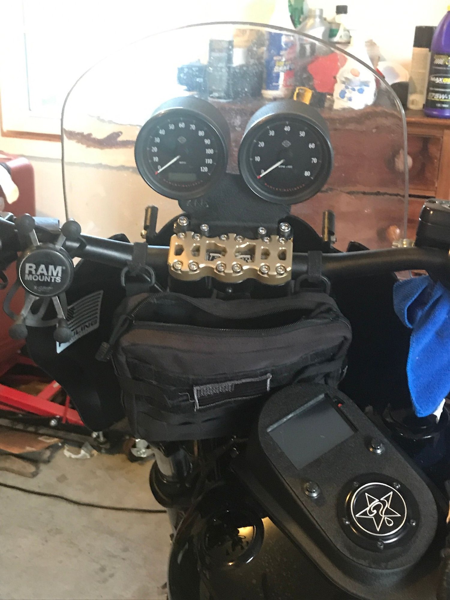 I have 7” Hardcase risers and they make a piece that allows you to mount your gauges under the top clamp.