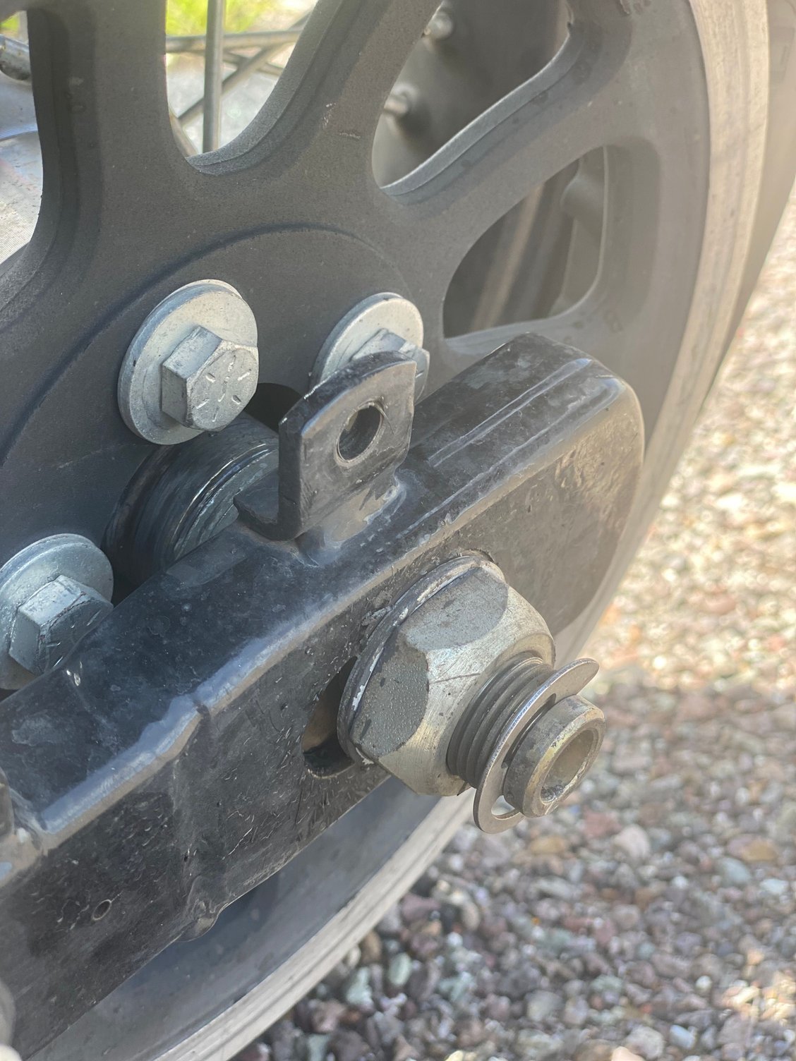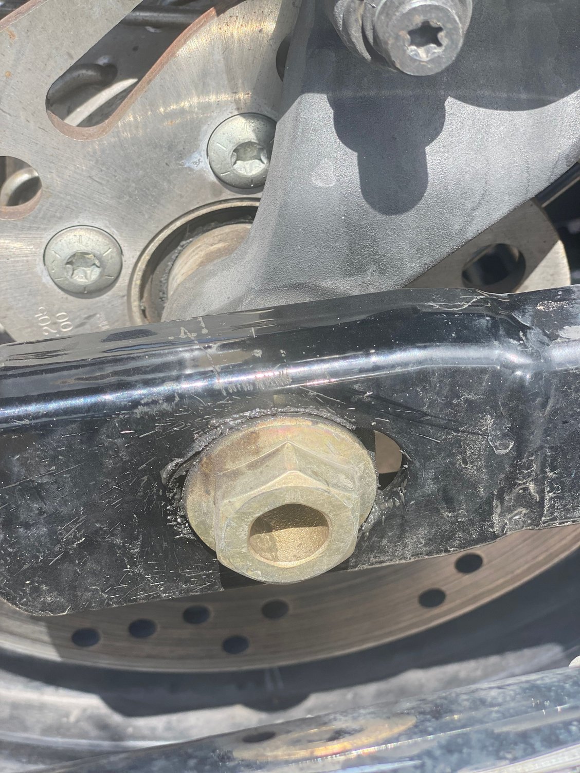 I agree with @Andy from Sandy , since it looks to me like the nuts aren't tight enough, so they're rubbing against the swingarm, causing that arced "wear" around them. I'd definitely check the torque on them and make sure it's right.