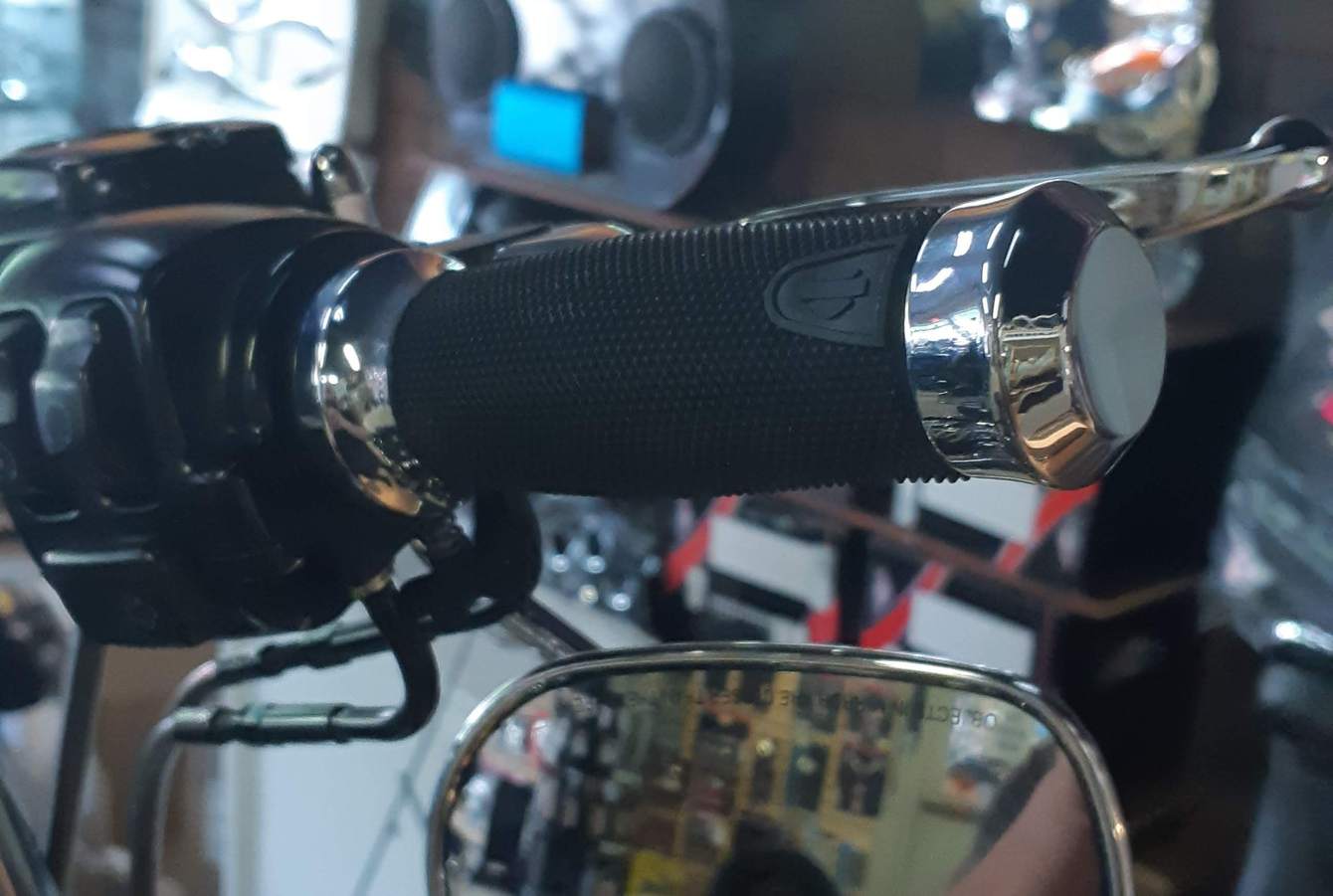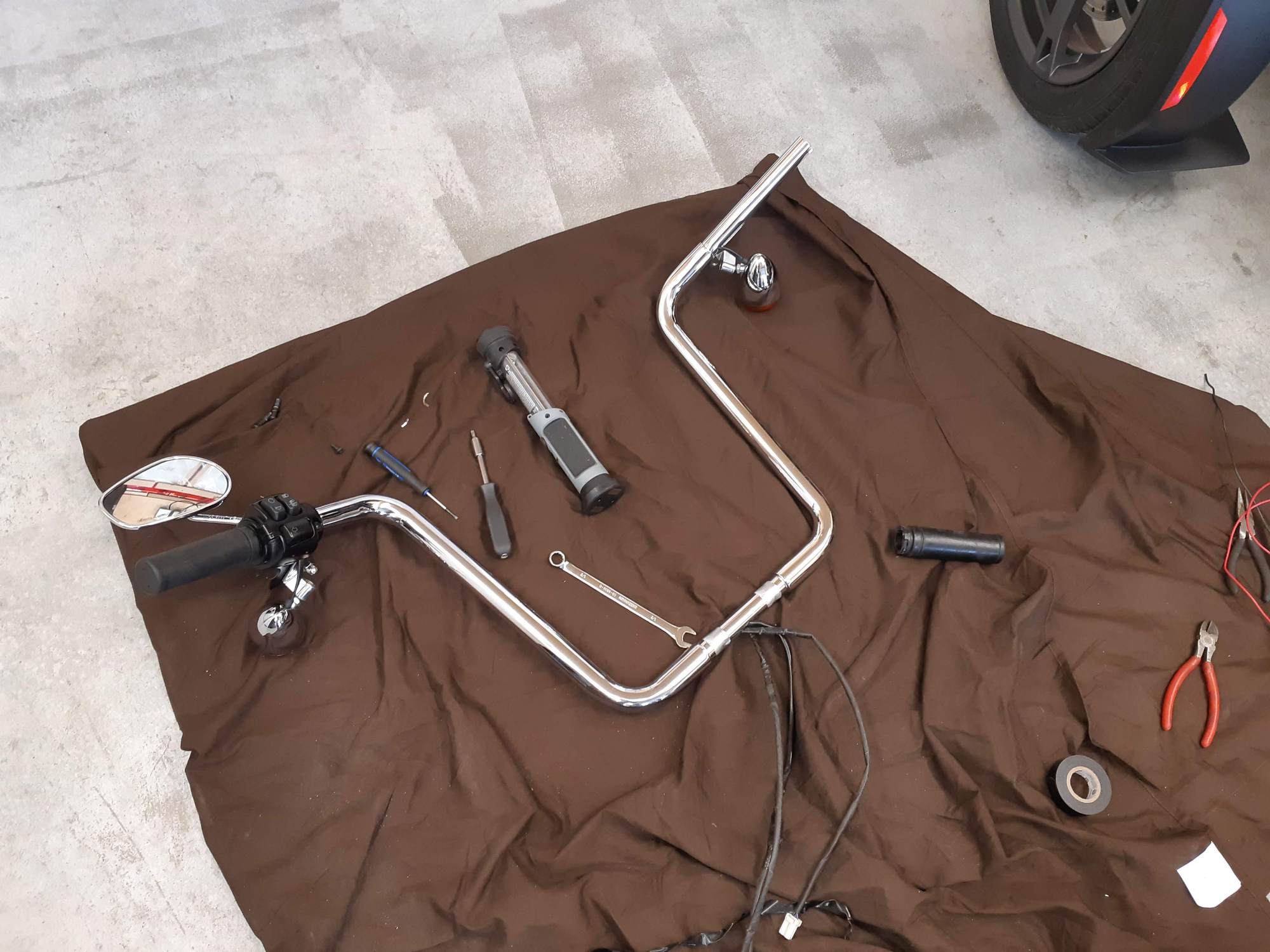 I decide to change the handlebar again.... There is a local company in Quebec called Iron Hold / MV Precision who made really great custom quality handlebar. I put an order on the "Gangster" style made by Carlini. Meantime, I'm redoing all the internal wirings for the handlebars and I changed the stock black switches caps for the chrome ones.