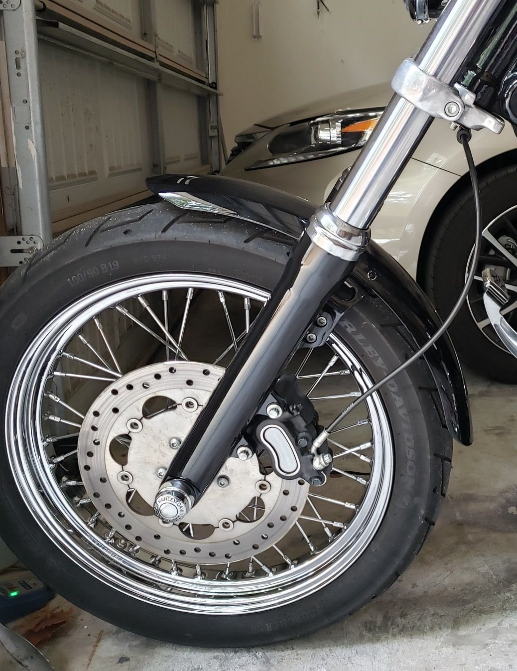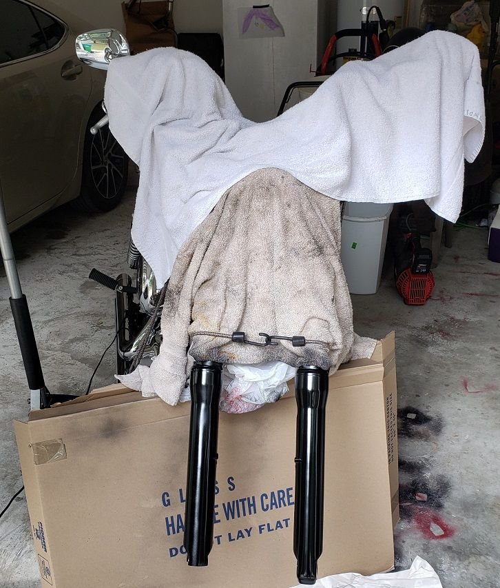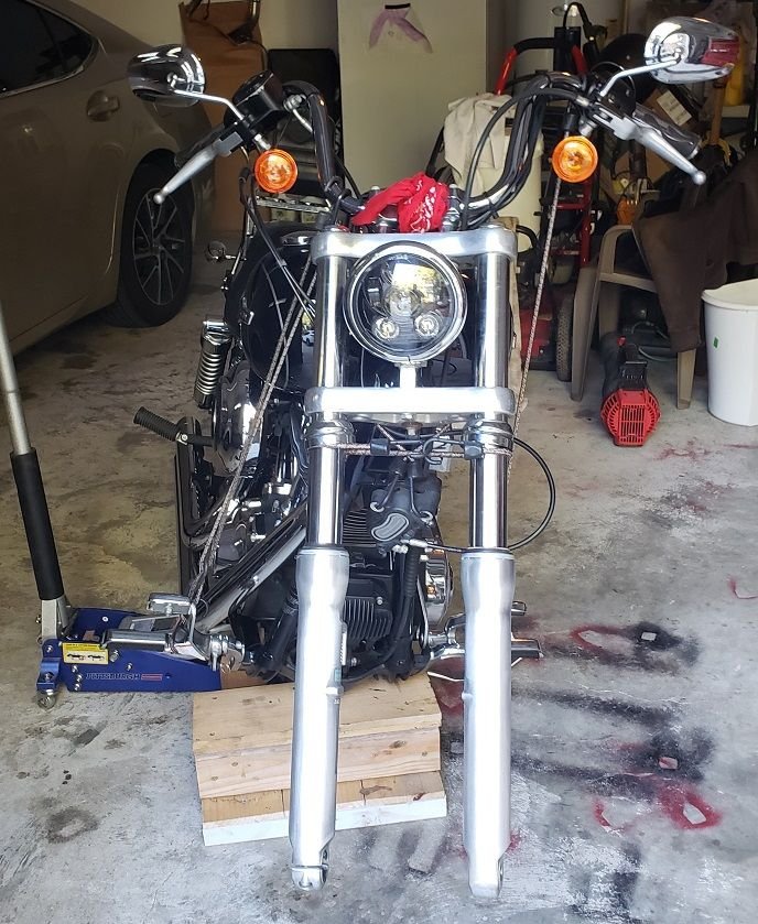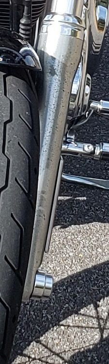 My recently purchased 2011 FXDC had some ugly lower front forks. I thought about chrome lowers, but other than the pitted peeling factory clear coat and the nasty overall look of the stock lower forks, everything else was fine. I bought Gorilla foam sanding pads (Medium + Course) and went to work. I spent about 3 hours total with the sanding, and was pleased with the results. I didn't even want to try to polish them (well, I did a little test area, and it is way more work than I want to put in).