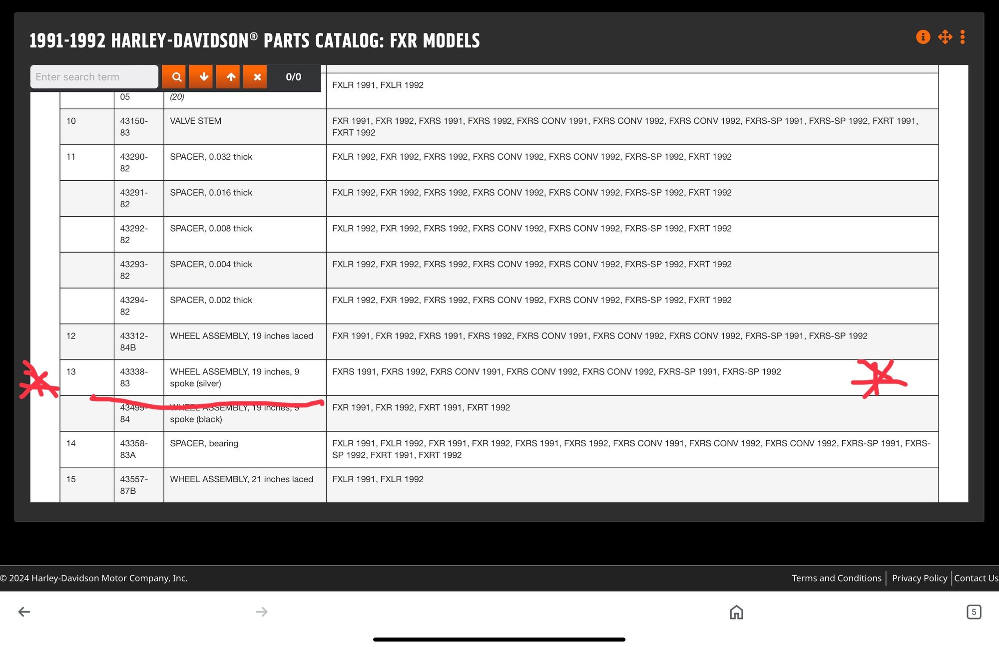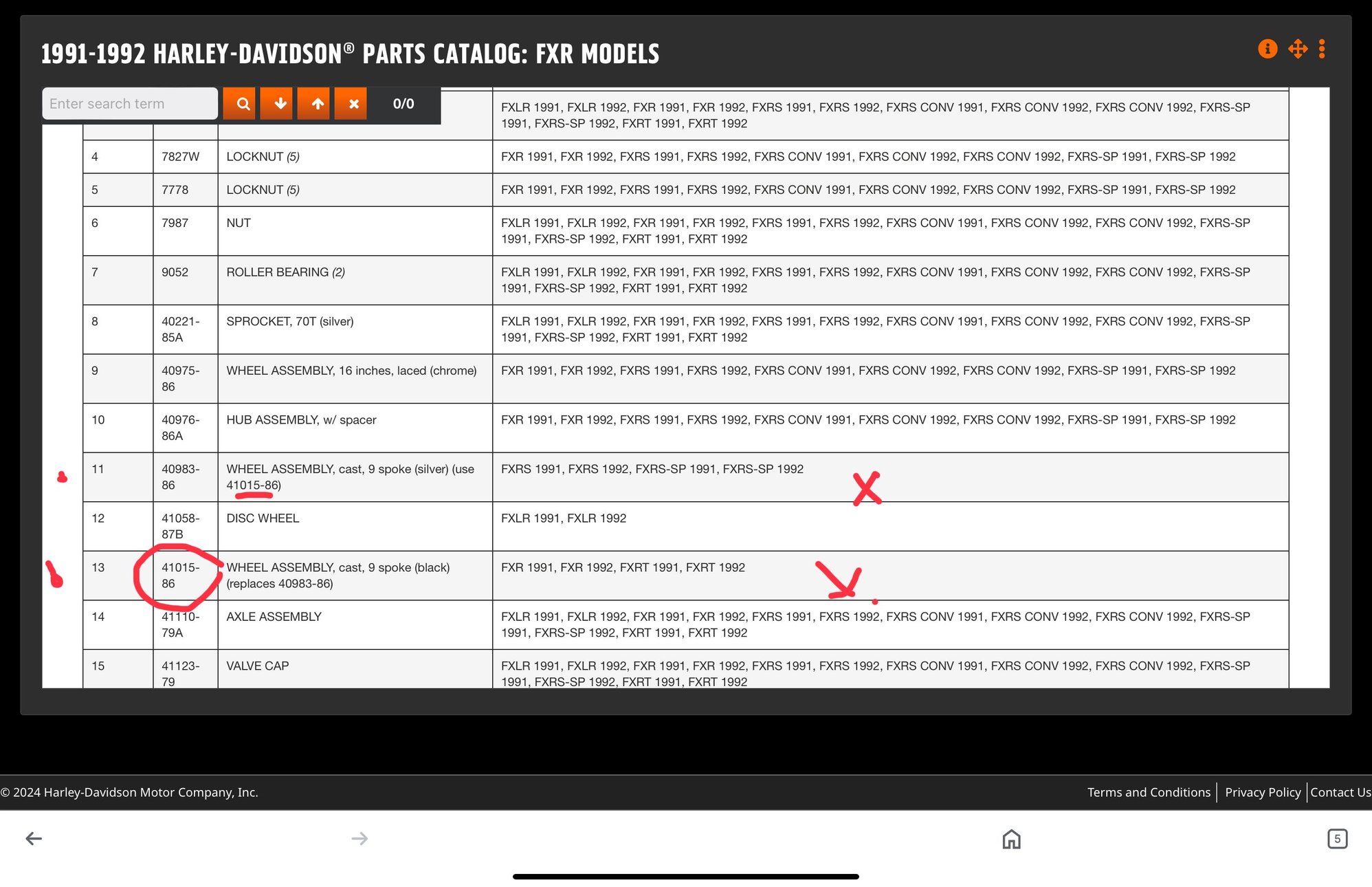 You'll probably have to pick out the correct wheels from their visual/physical features instead of a part#. They'll use a Tapered Roller wheel bearing and have the correct size "Locator" (spigot) for the brake rotor ... years 1984-95. Earlier wheels will have a larger "Locator" for use with the smaller 10" rotors. They may list the wheel as up to 1999, but technically Harley changed to the 13-spoke in 1996.