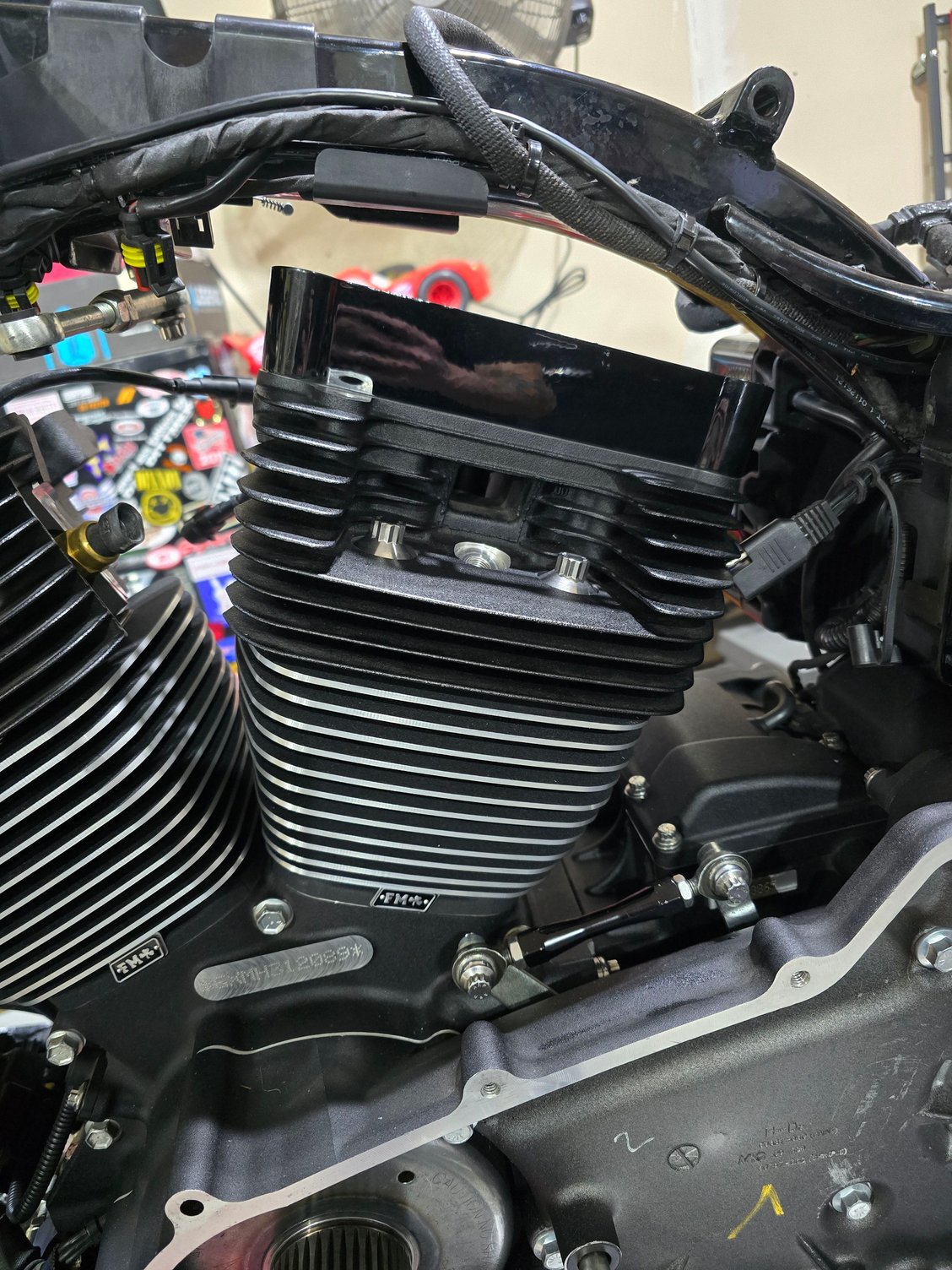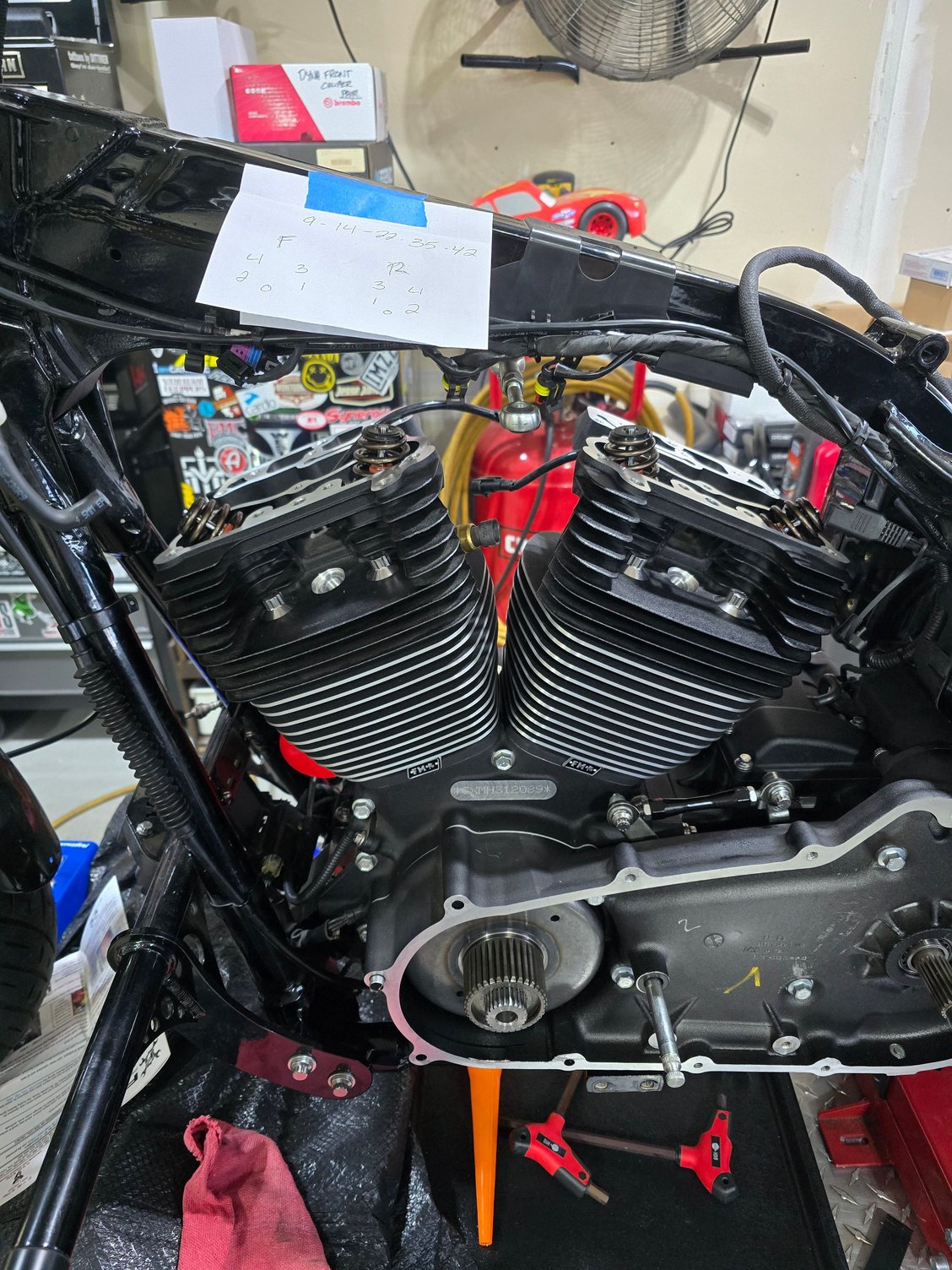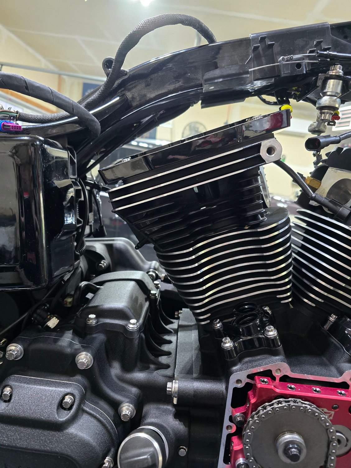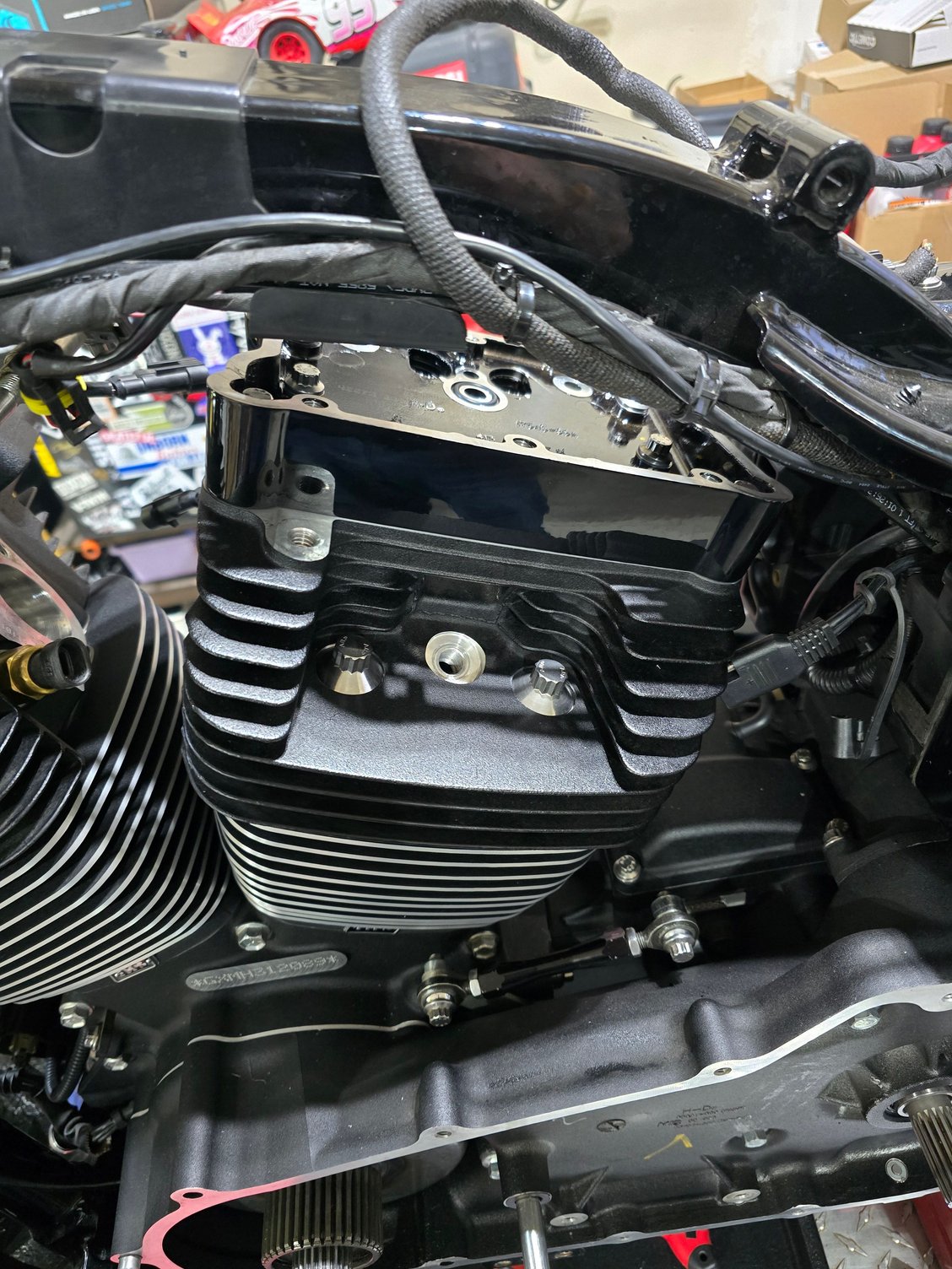 Got the heads on and torqued. It's an interesting look with polished fin jugs and the "Dark Custom" FXDB heads.